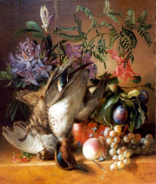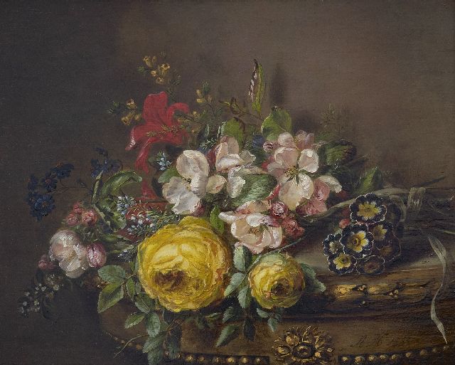Jacoba van der Stok | Stilleven met bloemen en fruit op een plint, olieverf op paneel, 26,2 x 30,1 cm, gesigneerd r.o. en gedateerd 1840