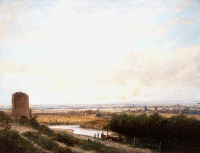 Barend Cornelis Koekkoek | Landvolk bij een rivier met ruïne, gewassen inkt en aquarel op papier, 17,4 x 26,5 cm, gesigneerd m.o.