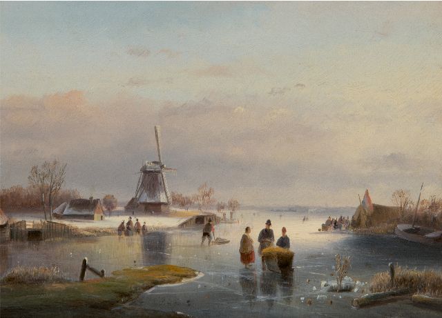 Barend Cornelis Koekkoek | IJsgezicht met schaatsers en houtsprokkelaars met een paardenslee, olieverf op doek, 29,0 x 35,7 cm, gesigneerd l.o. en gedateerd 1832