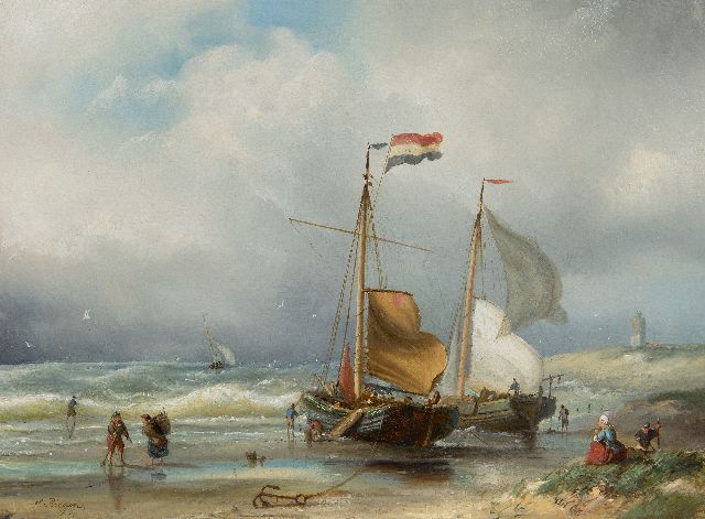 Charles Leickert | Bomschuiten op het strand bij ondergaande zon, olieverf op doek, 58,0 x 75,0 cm, gesigneerd r.o. en gedateerd 'London' 1845