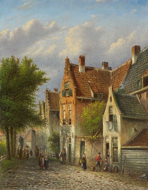 Johannes Franciscus Spohler | Bedrijvigheid in Hollands straatje, olieverf op doek, 45,4 x 35,6 cm, gesigneerd l.o. en zonder lijst