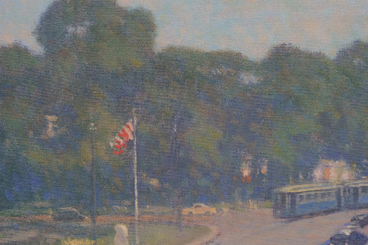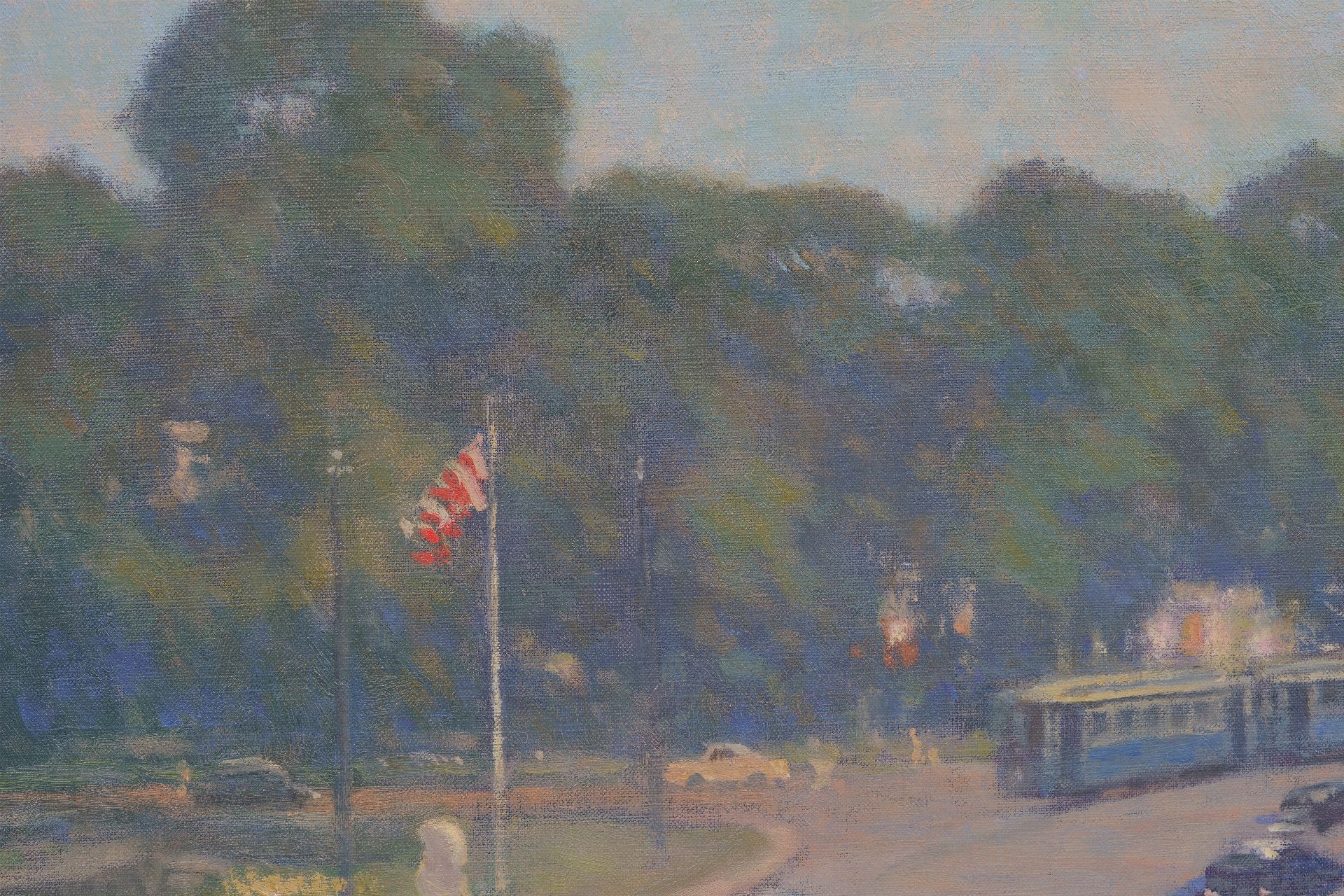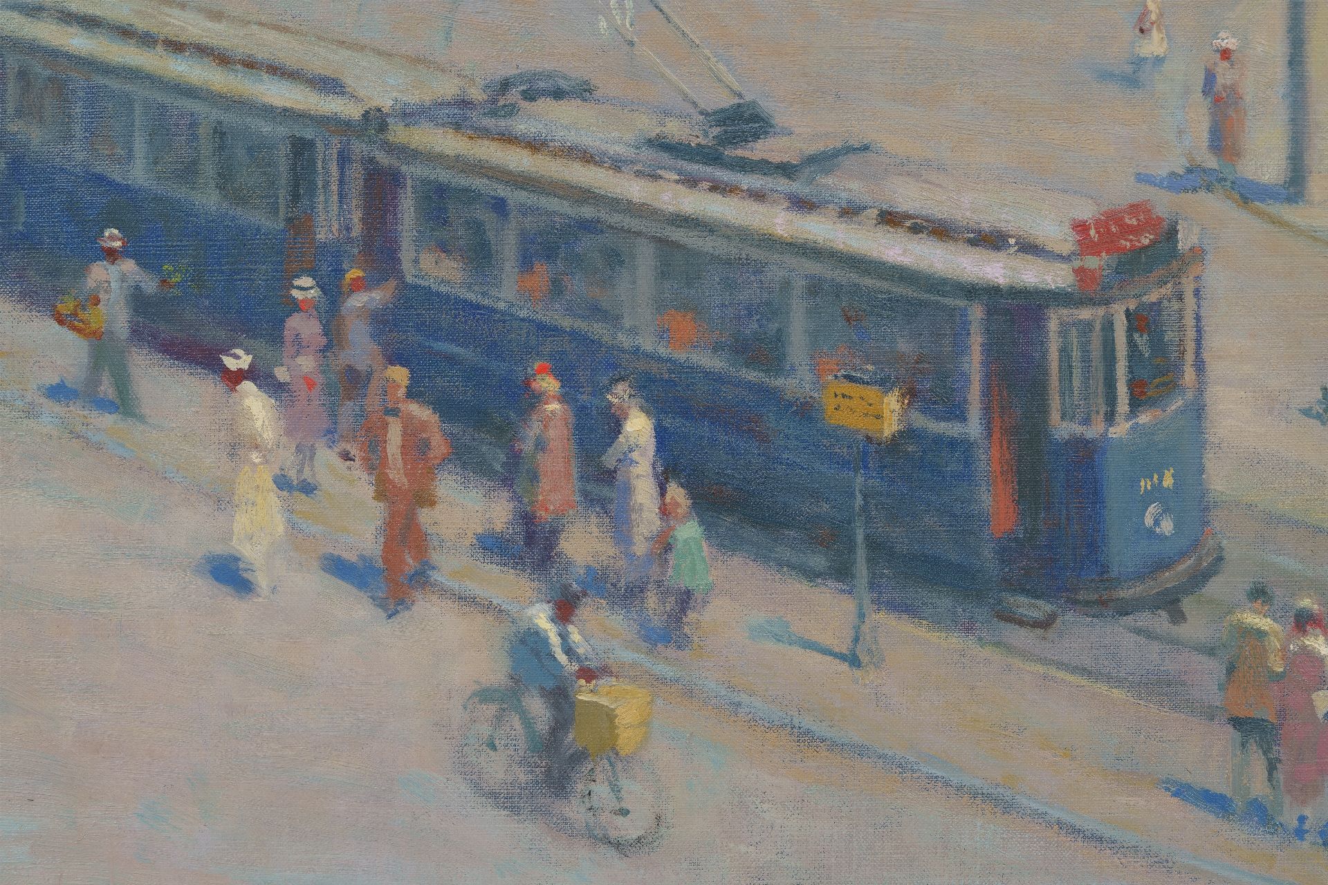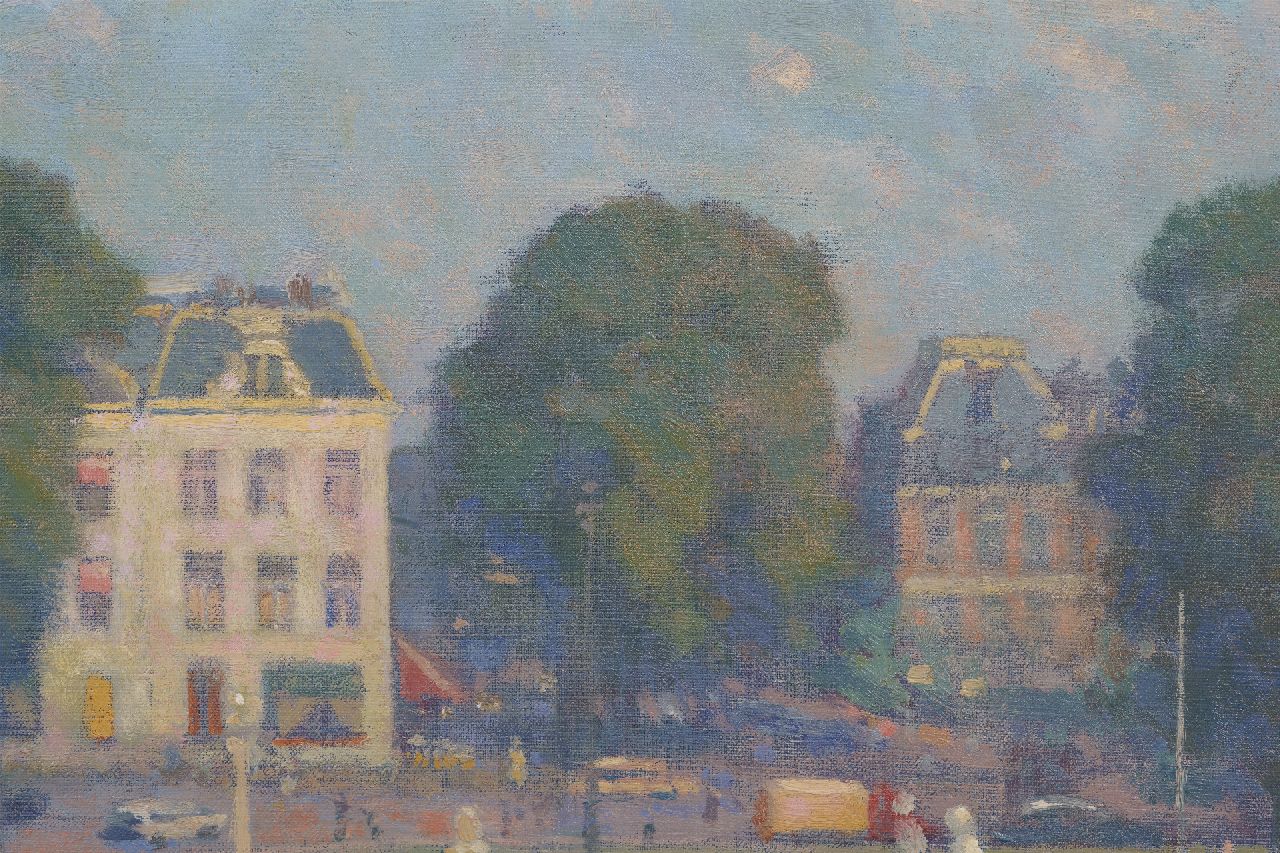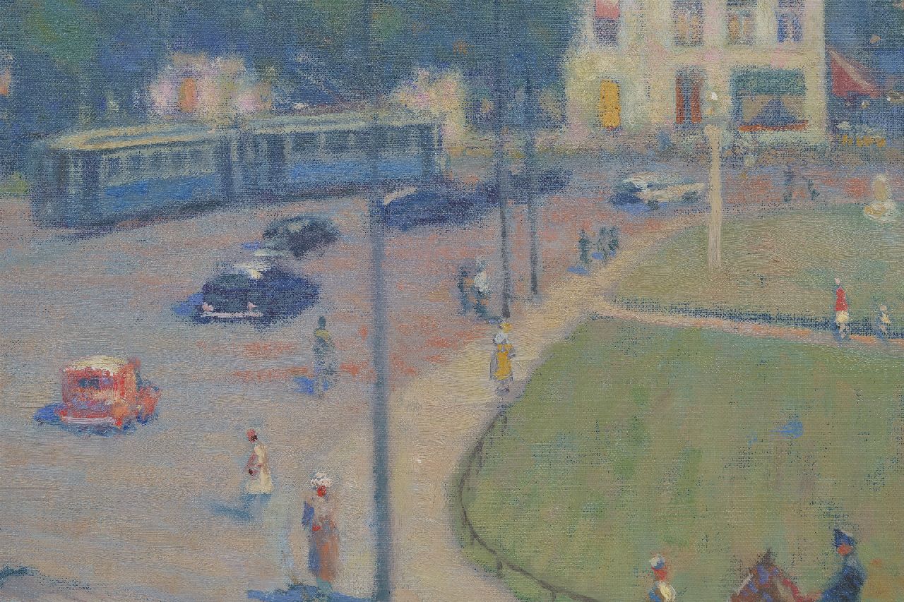 De Dordtse schilder Anthonie Pieter Schotel schilderde water en schepen, maar ook stadsgezichten en stillevens. In dit Amsterdamse stadsbeeld schildert hij het Frederiksplein, waar in 1951 een tentoonstelling van gipsen replica's van beroemde beelden werd gehouden. Enkele jaren later zou op deze plek het hoofdkantoor van De Nederlandsche Bank worden gebouwd.