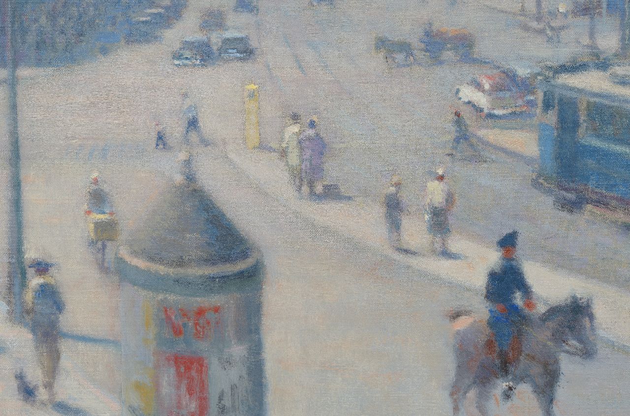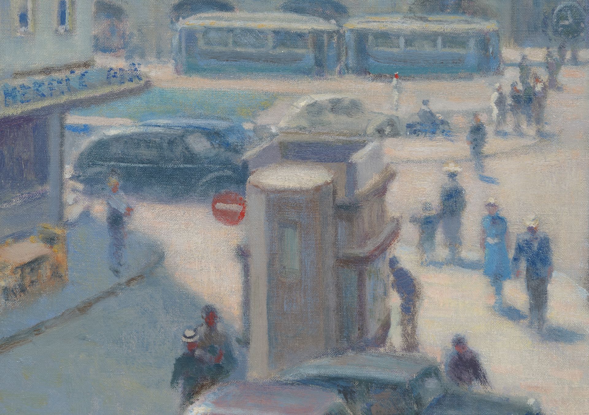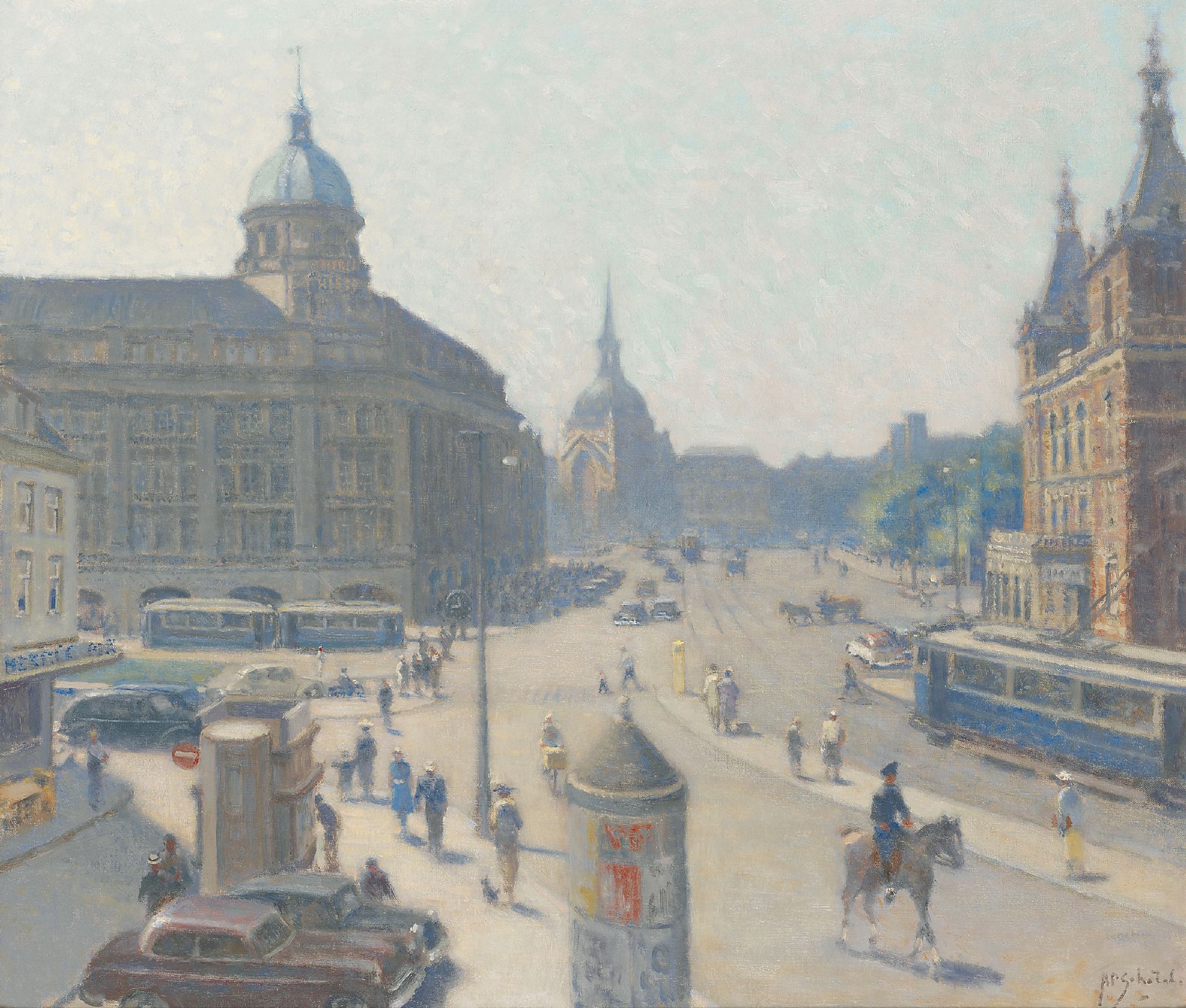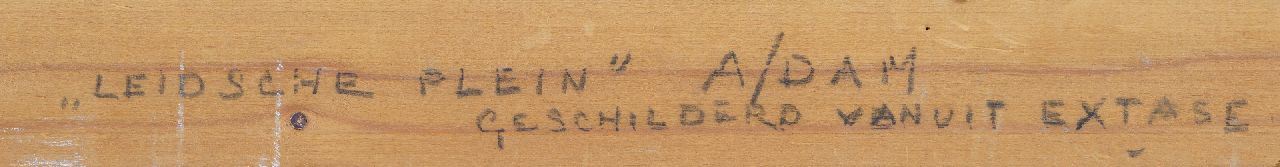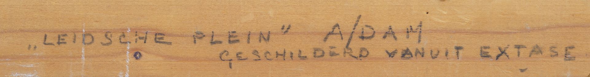 De stad Amsterdam is van oudsher geliefd bij kunstschilders. In de vroege 19e eeuw was onze hoofdstad het centrum van het romantische stadsgezicht. De romantische schilders waren verknocht aan de mooie gebouwen en schilderachtige grachten. Later lieten de Amsterdamse impressionisten vooral de dynamiek van de stad zien in hun werken. Voor Anthonie Pieter Schotel geldt dat hij een grote voorliefde had voor het vastleggen van rivier- en zeegezichten. Het zijn vooral tere, grijze tonen die hij gebruikt in zijn watergezichten. Omstreeks 1950 schildert hij het Leidseplein. Hij doet dit op een plek bovenin nachtclub ‘Extase’ en laat de Amsterdamse wereld zien door een zonnige nevelsluier.