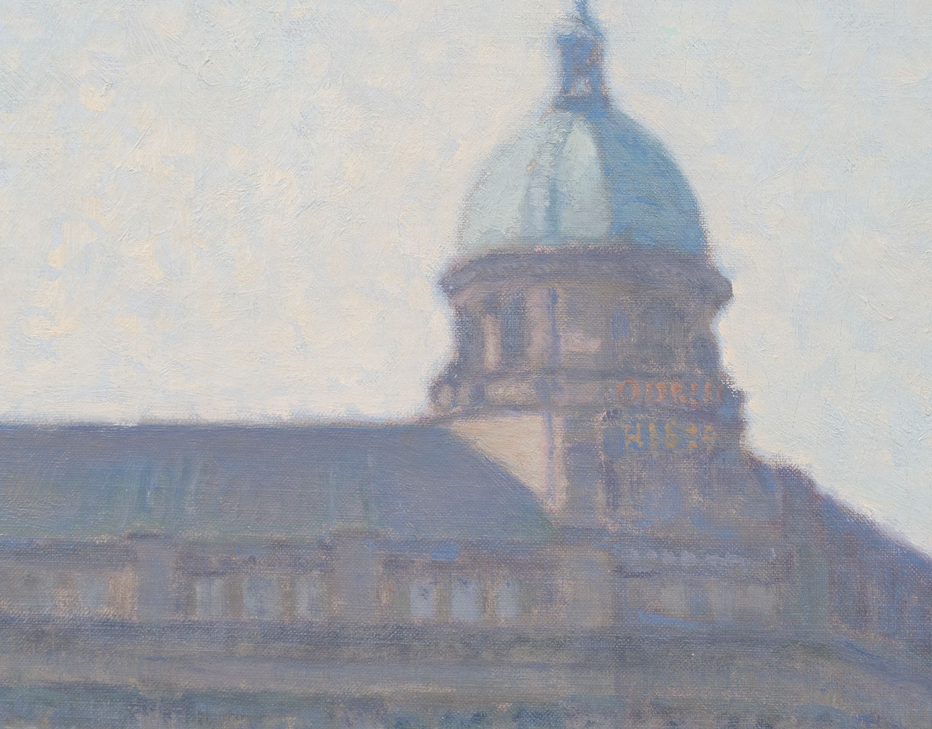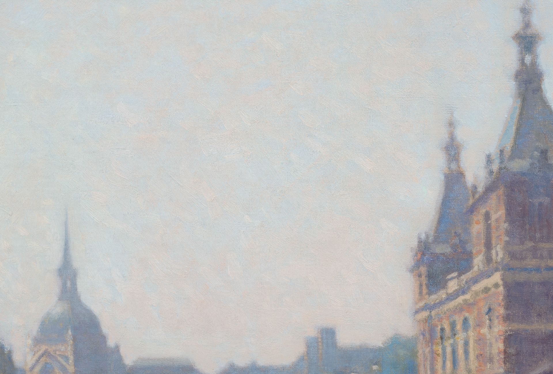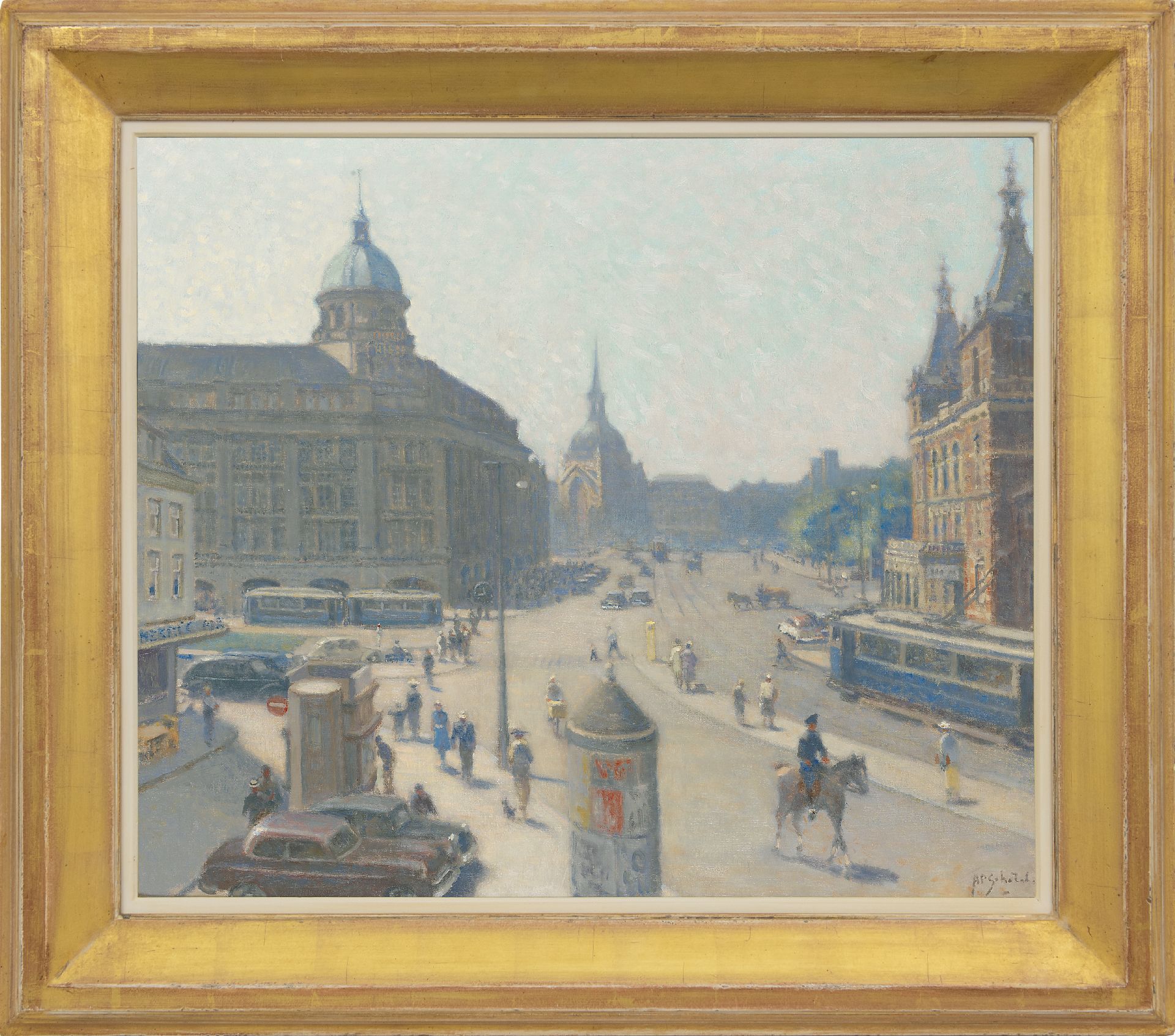 De stad Amsterdam is van oudsher geliefd bij kunstschilders. In de vroege 19e eeuw was onze hoofdstad het centrum van het romantische stadsgezicht. De romantische schilders waren verknocht aan de mooie gebouwen en schilderachtige grachten. Later lieten de Amsterdamse impressionisten vooral de dynamiek van de stad zien in hun werken. Voor Anthonie Pieter Schotel geldt dat hij een grote voorliefde had voor het vastleggen van rivier- en zeegezichten. Het zijn vooral tere, grijze tonen die hij gebruikt in zijn watergezichten. Omstreeks 1950 schildert hij het Leidseplein. Hij doet dit op een plek bovenin nachtclub ‘Extase’ en laat de Amsterdamse wereld zien door een zonnige nevelsluier.