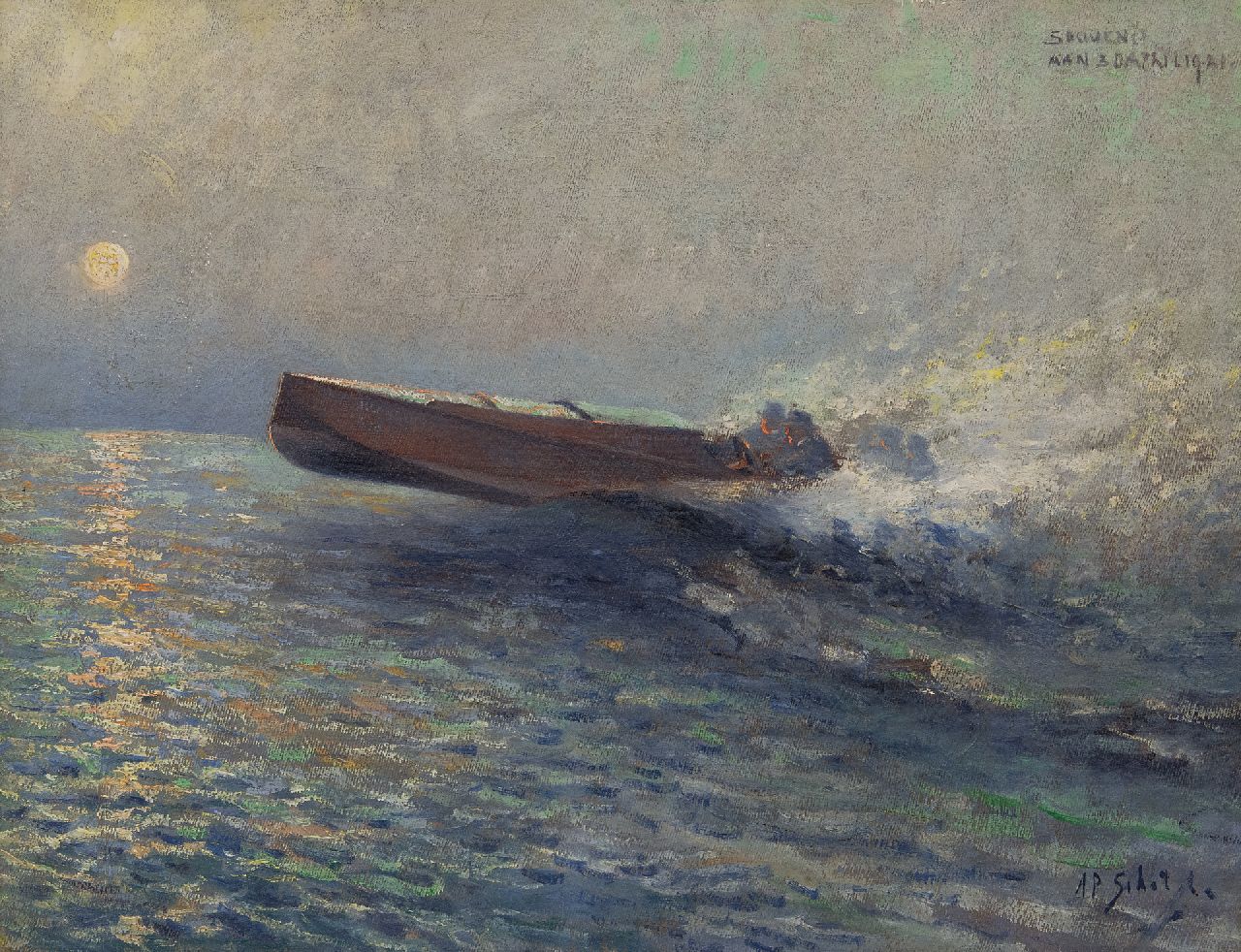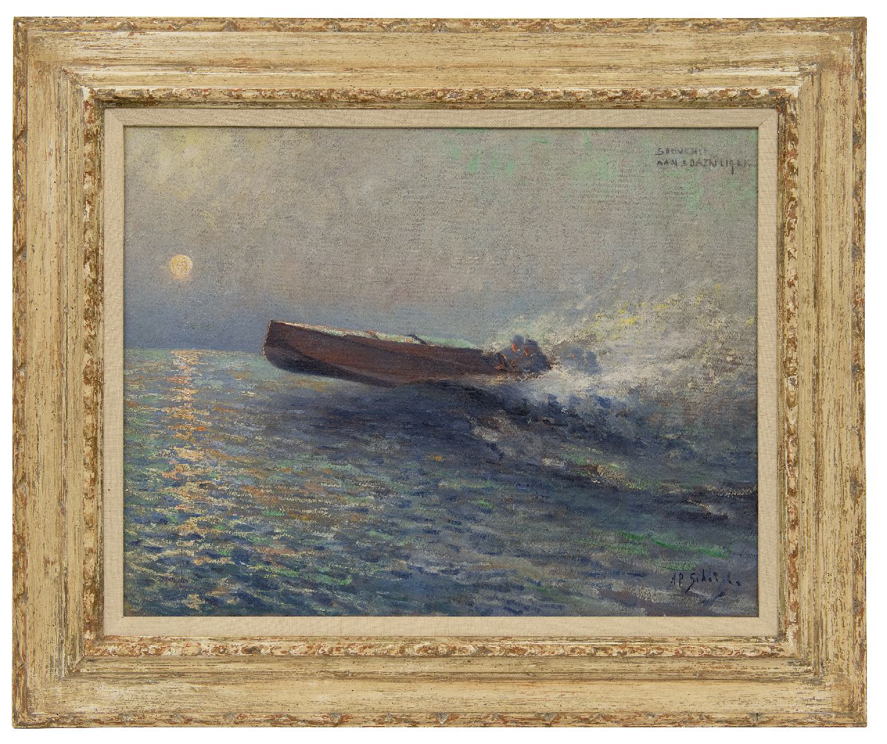 A.P. Schotel kunstwerk • schilderij • voorheen te koop Speedboot op zee bij zonsondergang