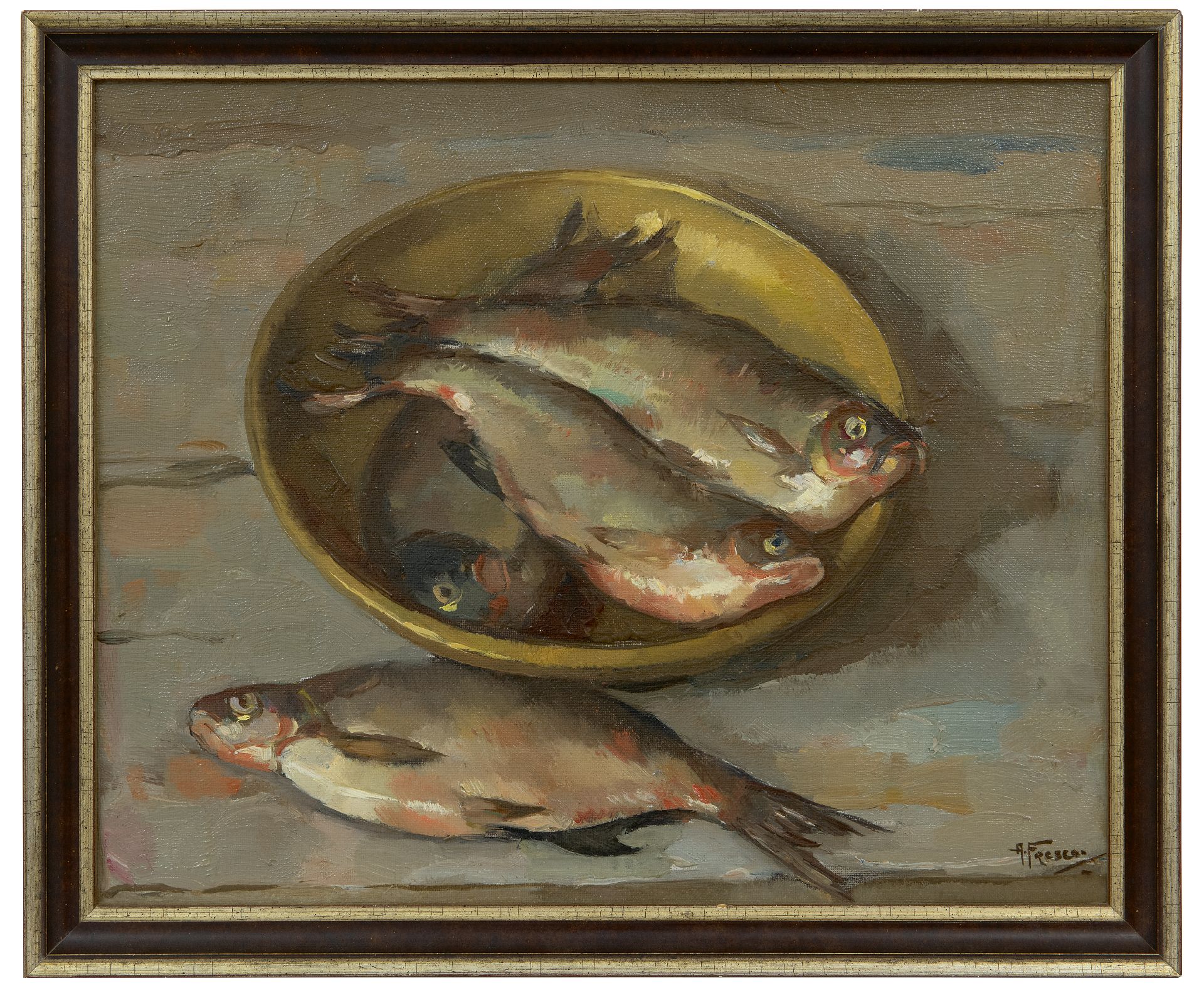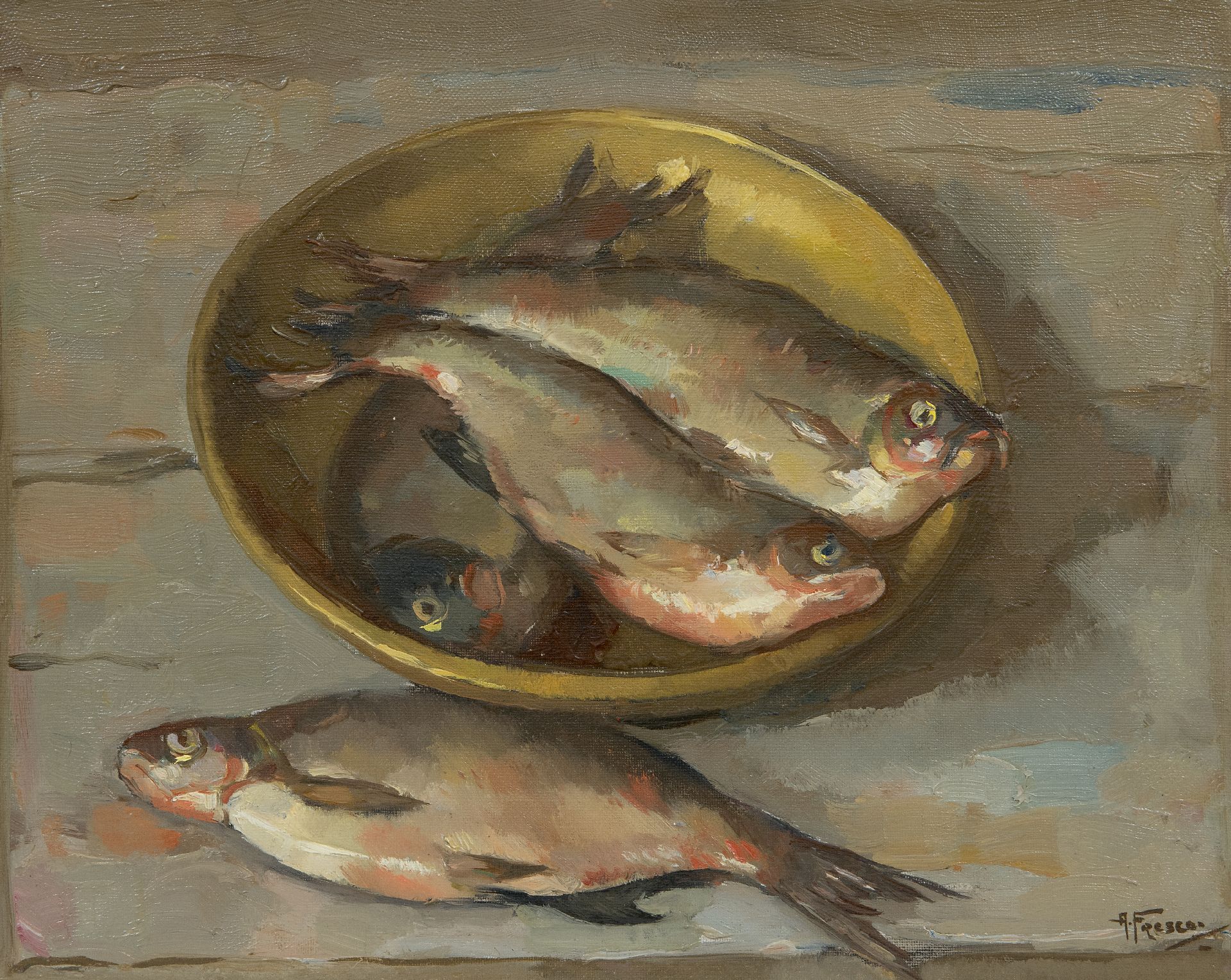 Abraham Fresco kunstwerk • schilderij • voorheen te koop Haringen in een schaal