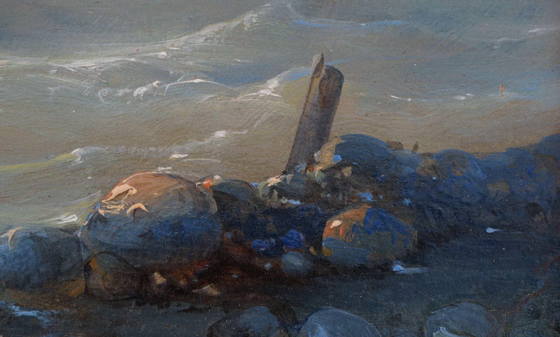 Abraham Hulk | Schepen in een storm bij een rotskust, aquarel en gouache op karton, 9,5 x 15,0 cm, gesigneerd r.o.