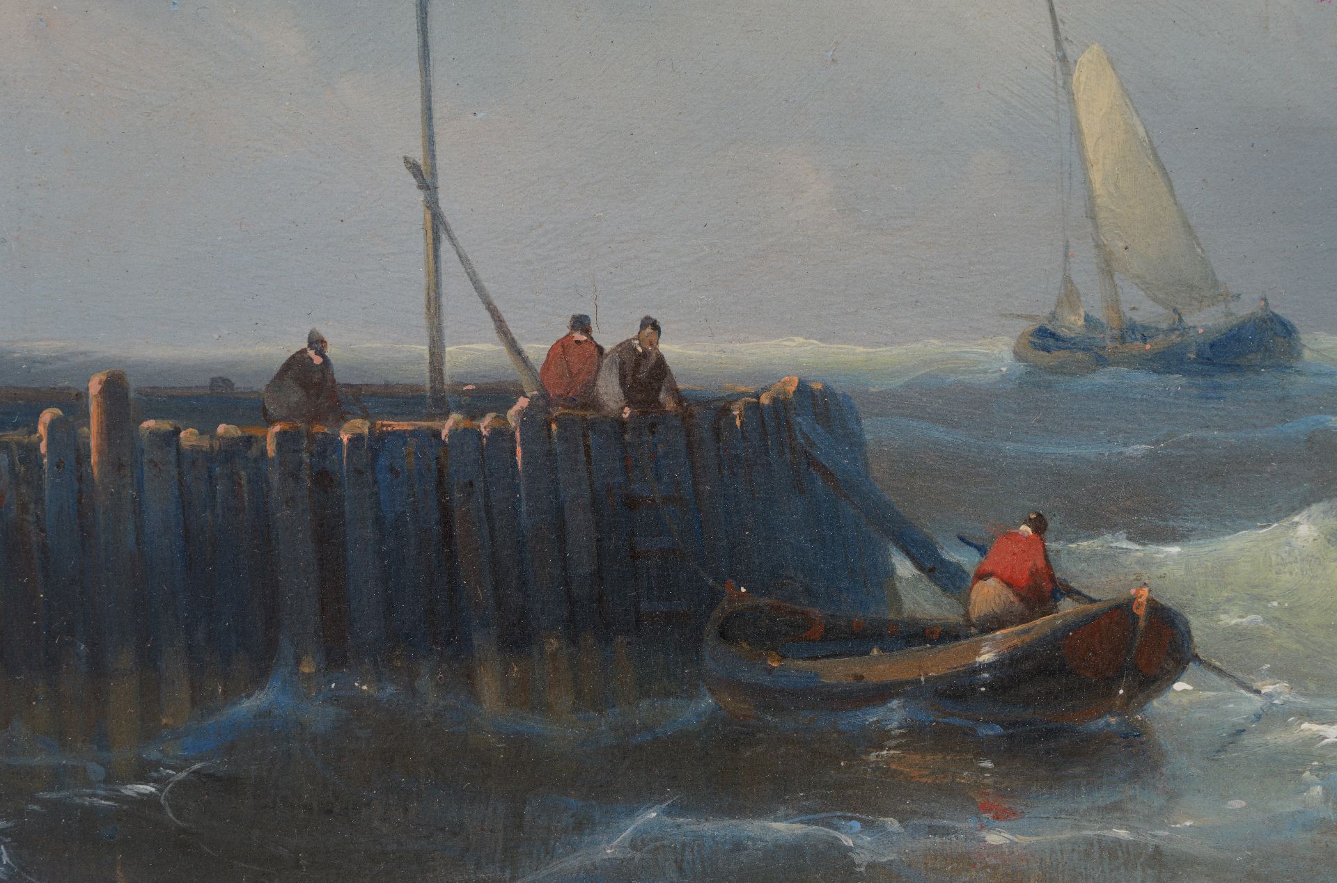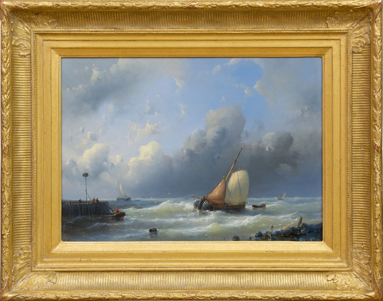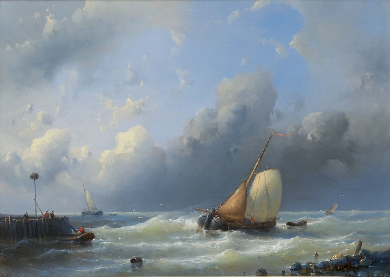 Abraham Hulk | Zeilschepen voor een woelige haveningang, olieverf op doek, 56,7 x 86,2 cm, gesigneerd r.o.