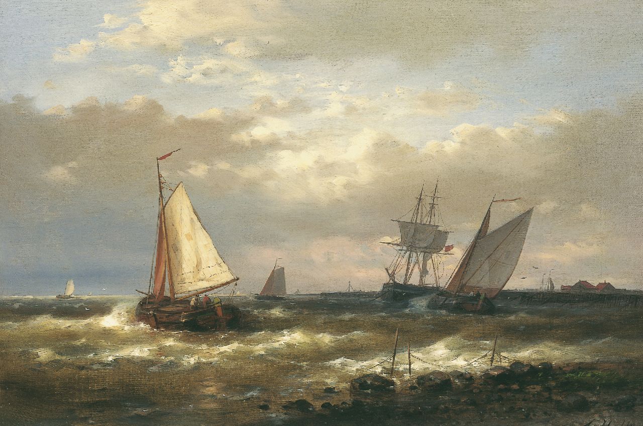 Abraham Hulk kunstwerk • schilderij • voorheen te koop Laverende zeilschepen bij een havenmond
