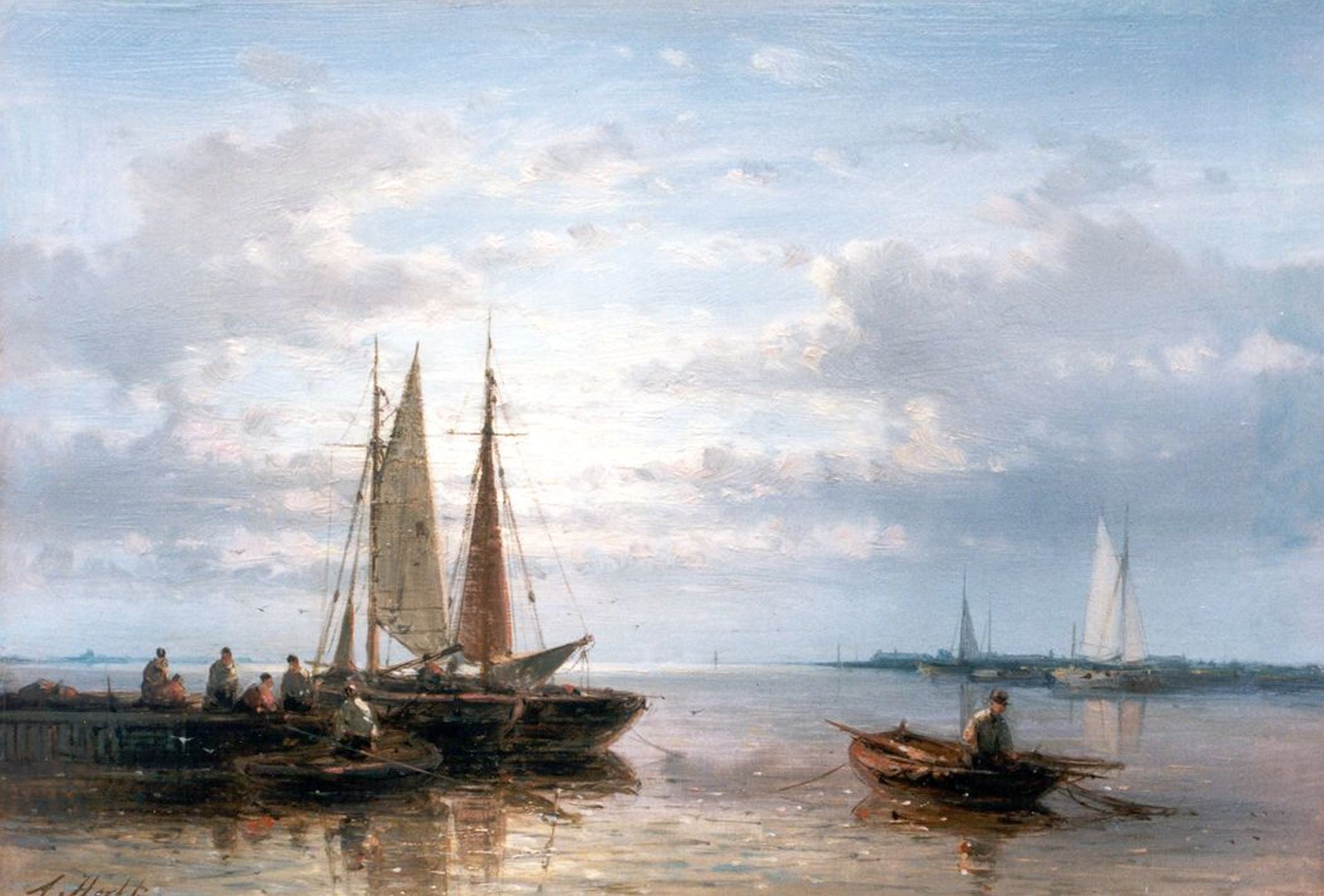 Abraham Hulk kunstwerk • schilderij • voorheen te koop Zomeravond met visserschepen aan de waterkant