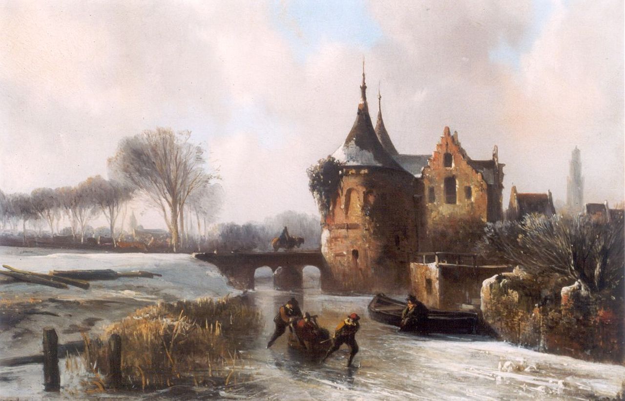 Abraham van der Wayen Pieterszen kunstwerk • schilderij • voorheen te koop Schaatsplezier in een winterlandschap