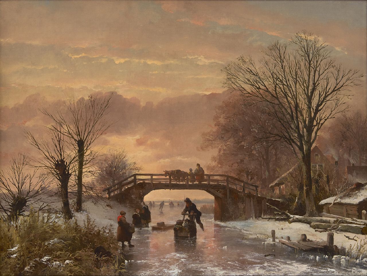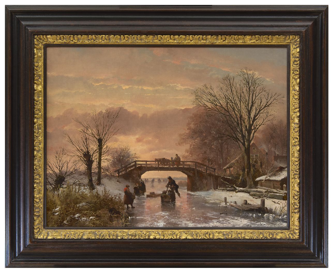 Abraham van der Wayen Pieterszen kunstwerk • schilderij • voorheen te koop Vertier op het ijs bij zonsondergang