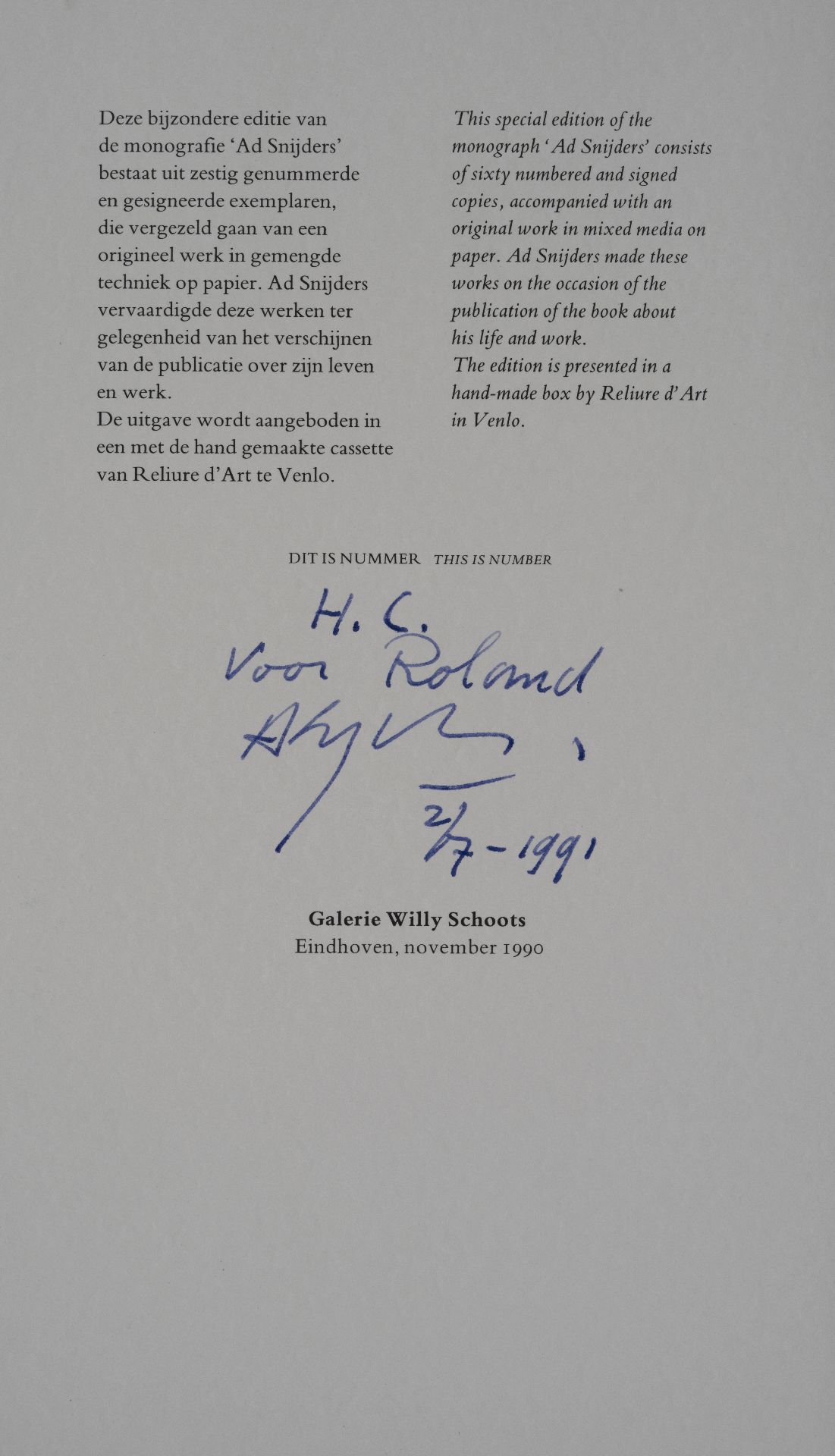 De Eindhovense kunstenaar Ad Snijders behoort tot de schilders die na de Tweede Wereldoorlog individueel op zoek gingen naar een nieuwe beeldtaal. Daarin is steeds de uitdrukkingskracht van kleur belangrijk. In de jaren 50 schildert hij meestal wervelende, dynamische abstract-expressionistische doeken. Daarna volgt een periode met geschilderde, collageachtige figuratieve voorstellingen. In de jaren 80 overheersen grote vormen en felle kleuren tegen een zwarte achtergrond. De figuratie blijft daarna een rol spelen in zijn werk. In 2002 organiseerde Rudi Fuchs een overzichtstentoonstelling van Ad Snijders. In 2003 en 2004 had hij solotentoonstellingen in het Van Abbemuseum in Eindhoven.