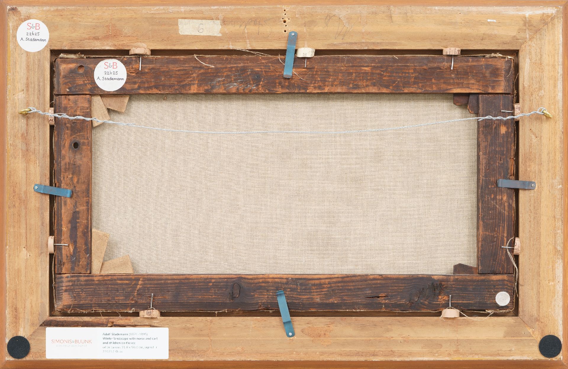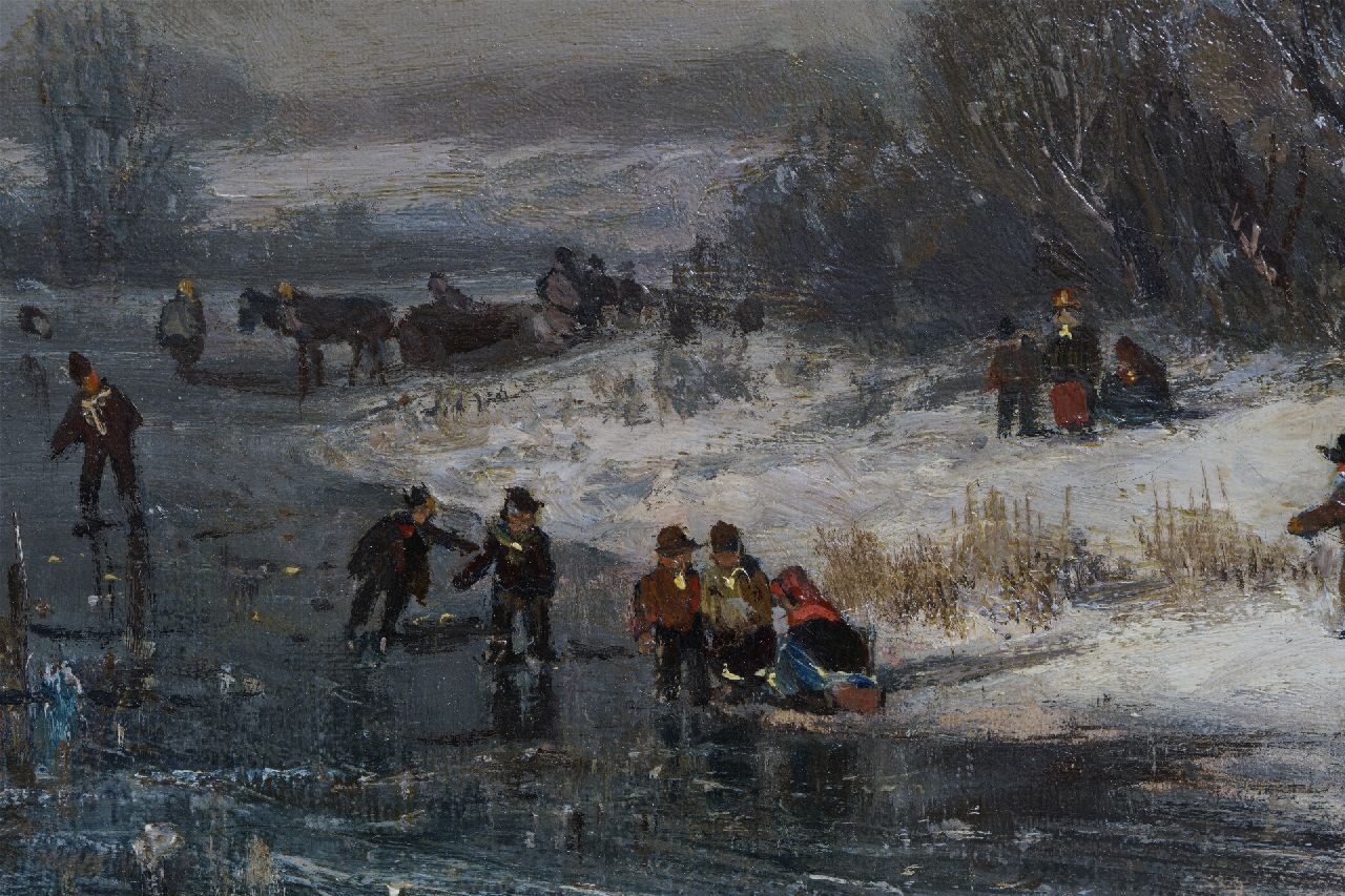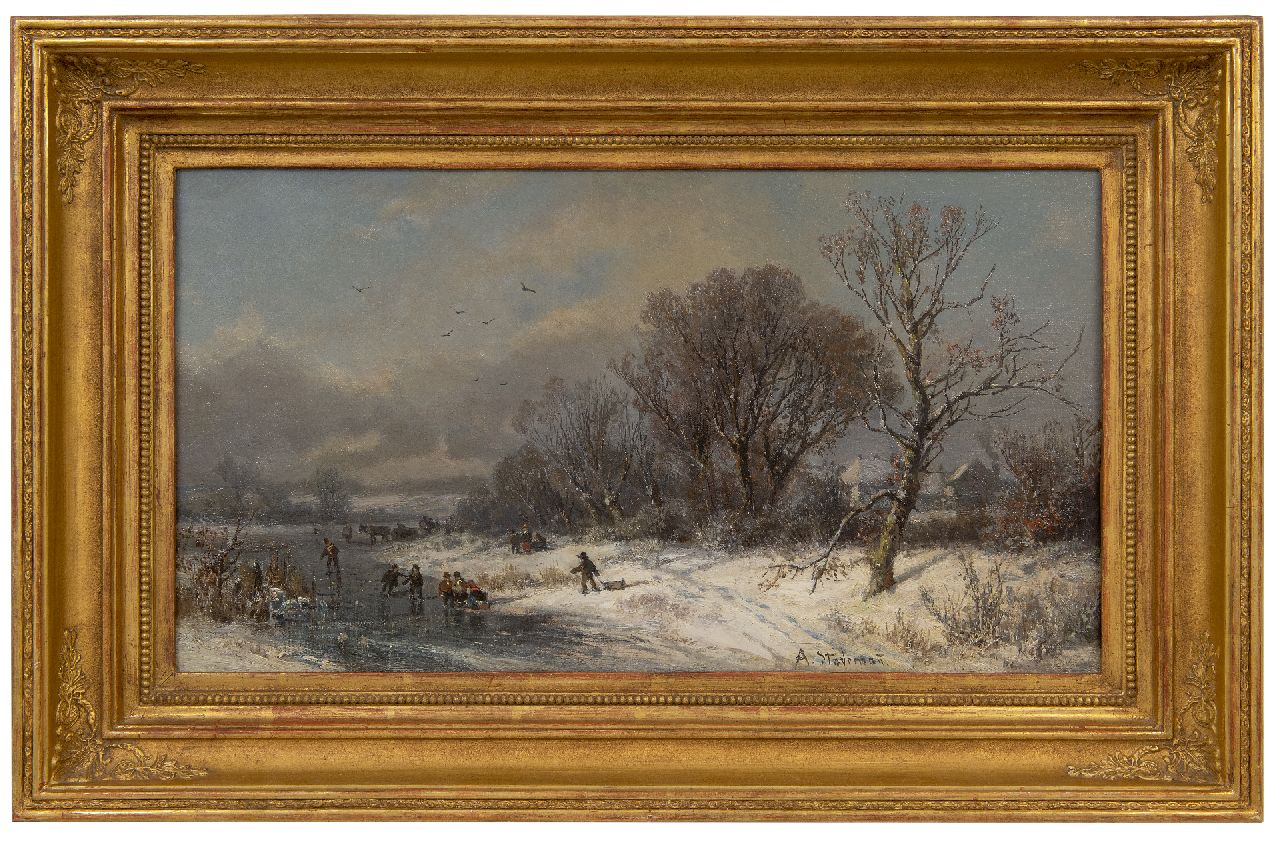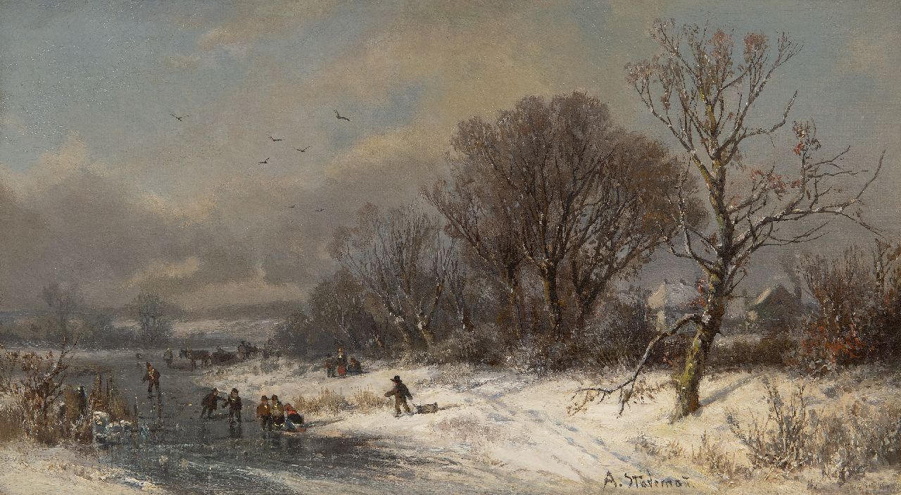 Adolf Stademann kunstwerk • schilderij • te koop Winterlandschap met paard en wagen en spelende kinderen op het ijs