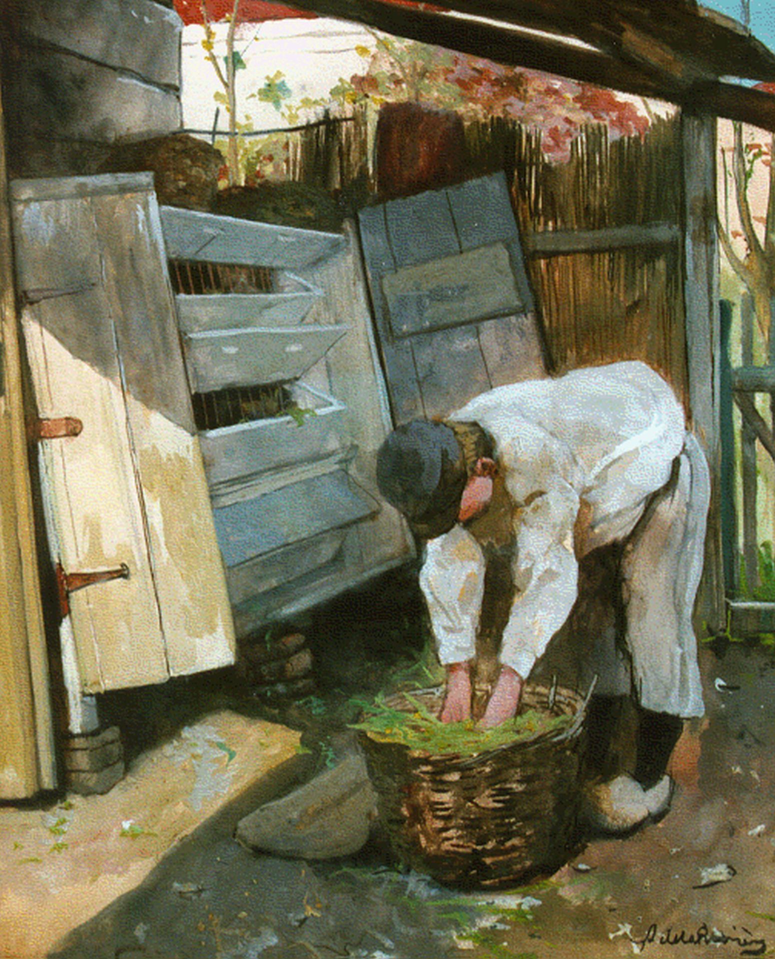 Adriaan de la Rivière kunstwerk • aquarel • tekening • voorheen te koop Boertje voert de konijnen