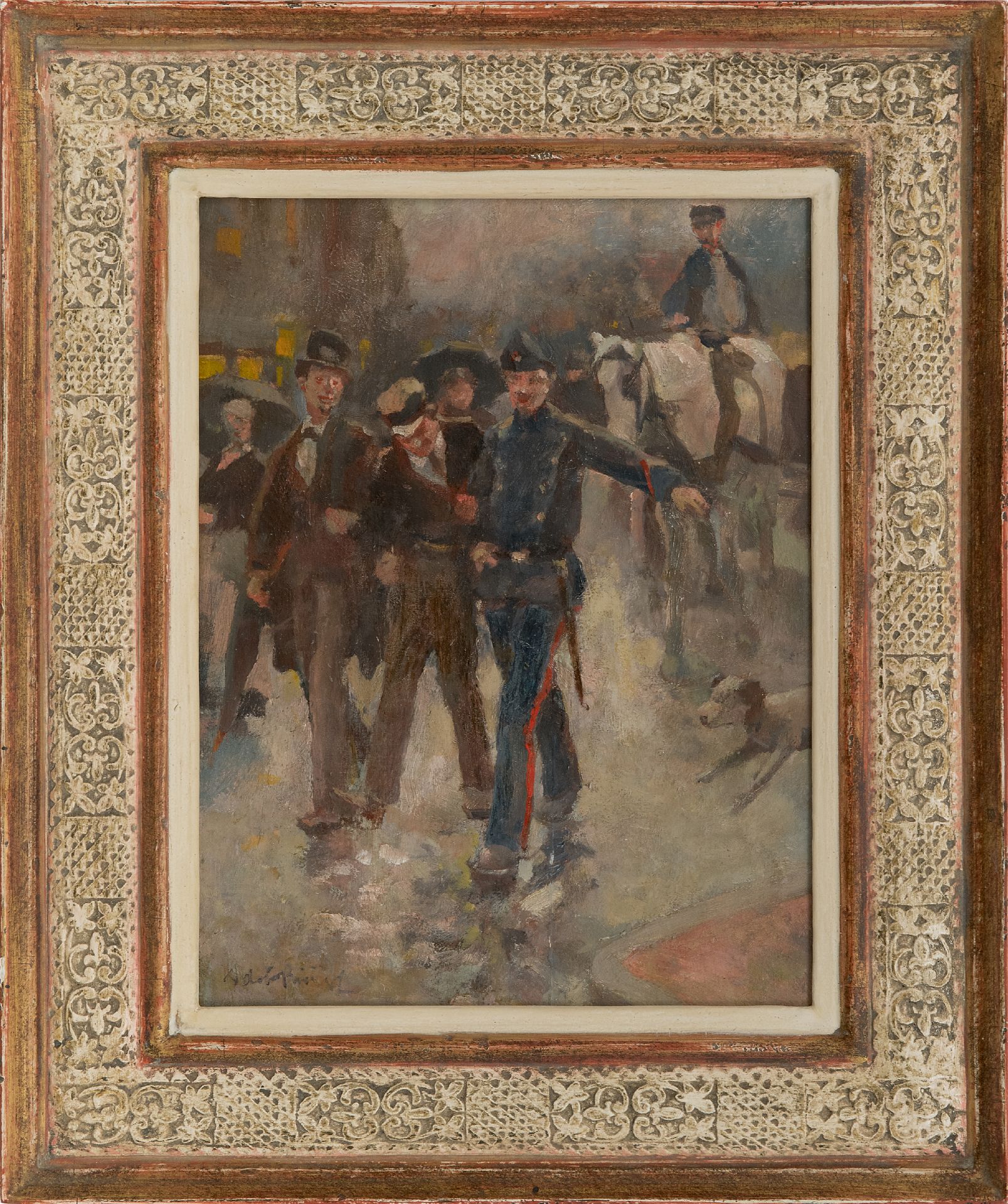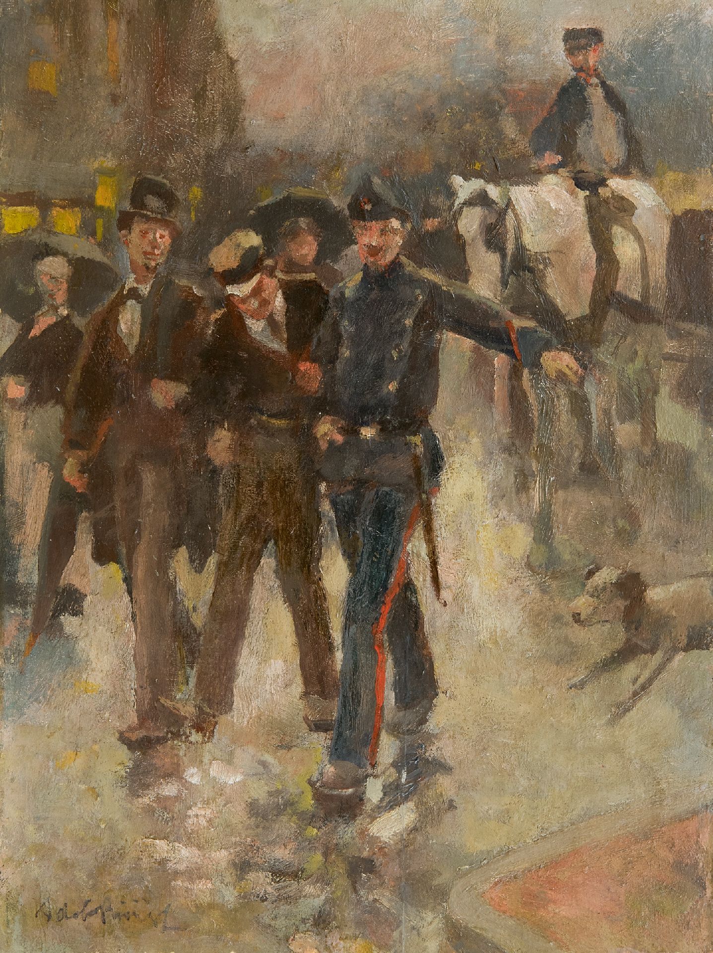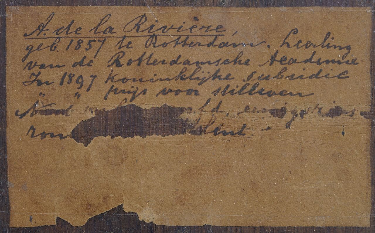 Adriaan de la Rivière schilderde tussen ongeveer 1880 en 1940 sterk verhalende genrestukken van het alledaagse leven in de stad en op het platteland in een lichtvoetige, impressionistische stijl. Zijn oeuvre omvat stadsgezichten met veel figuren, herbergscènes, marktstallen met verkopers van allerlei aard, boeren aan het werk op het land en parkscènes. De schilder werd opgeleid aan de academie van Rotterdam en studeerde met een beurs in München. Tussen 1894 en 1896 was hij bestuurslid van de Kunstkring Rotterdam.