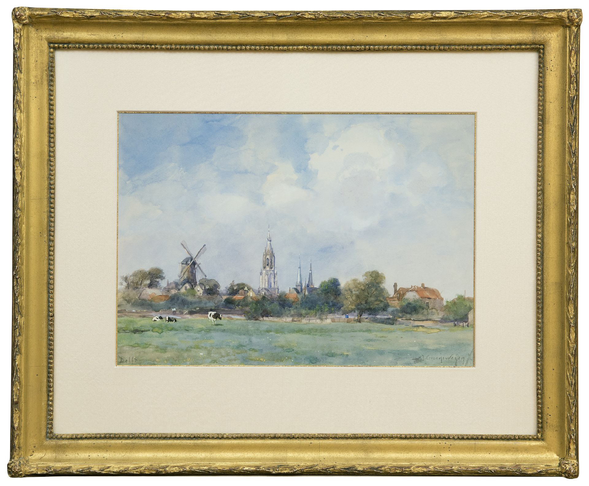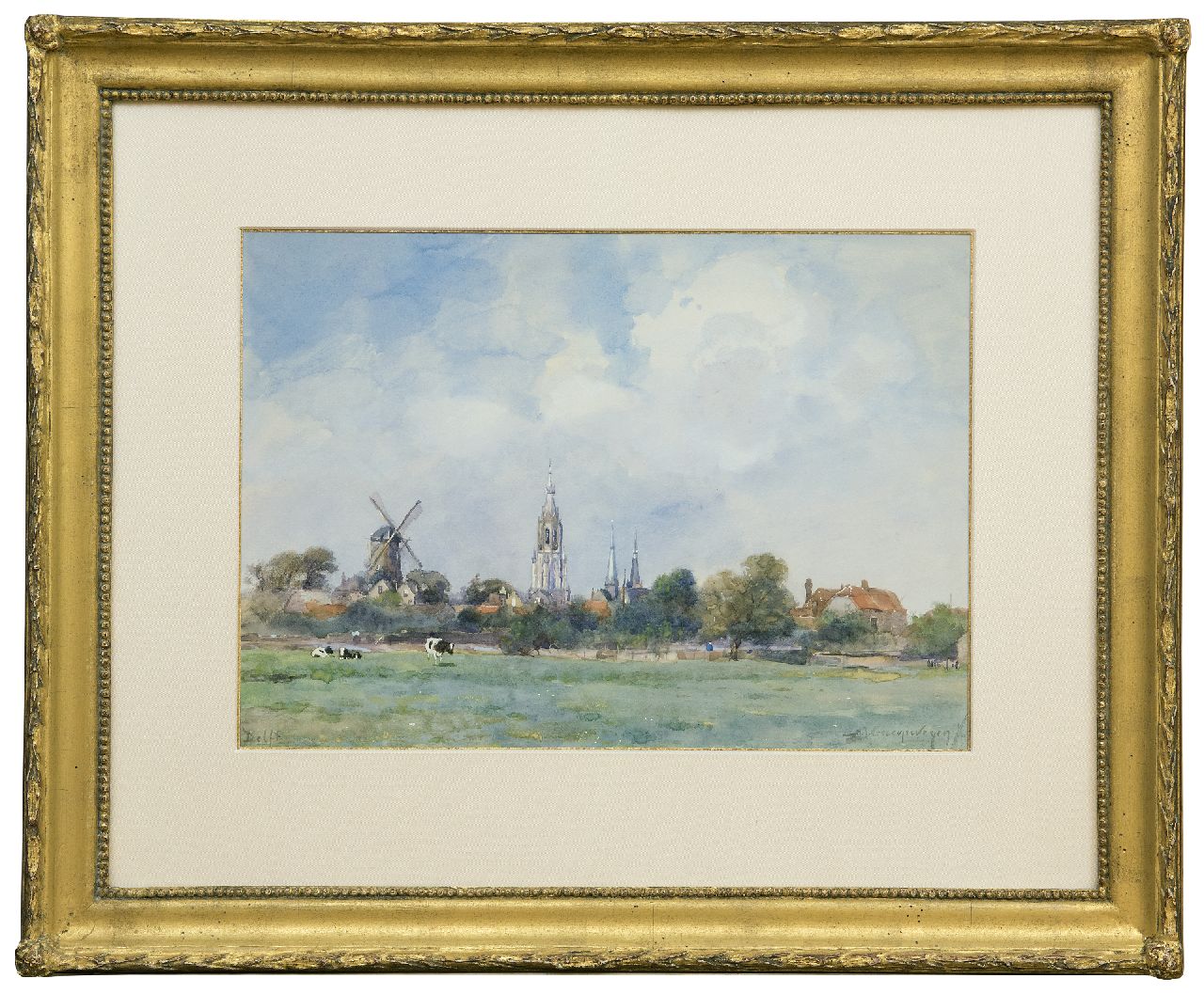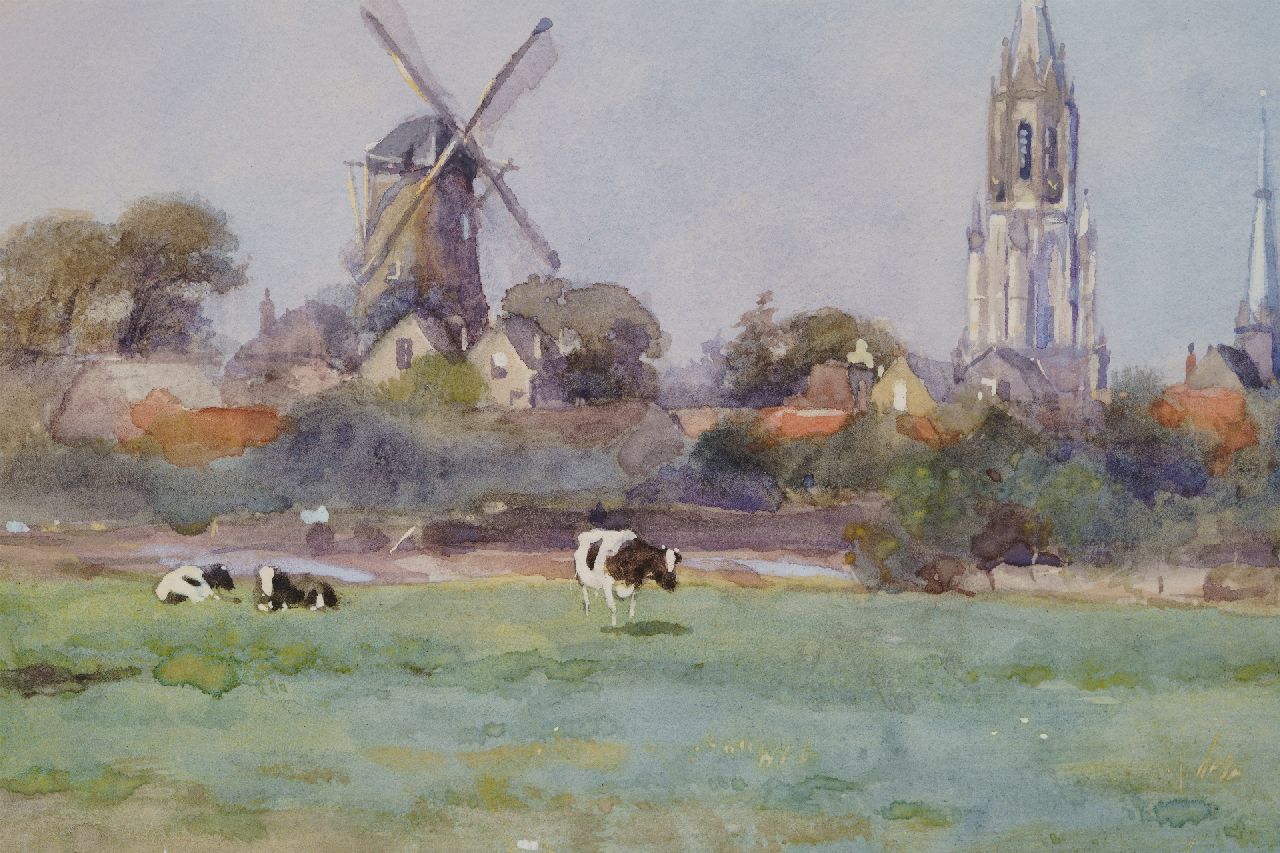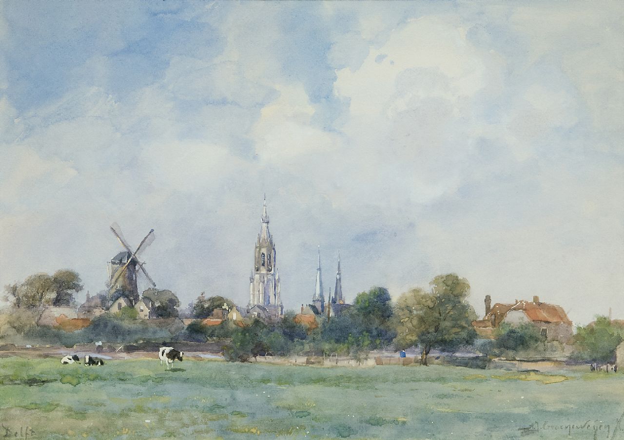 Adriaan Groenewegen kunstwerk • aquarel • tekening • voorheen te koop Gezicht op Delft met de Nieuwe Kerk