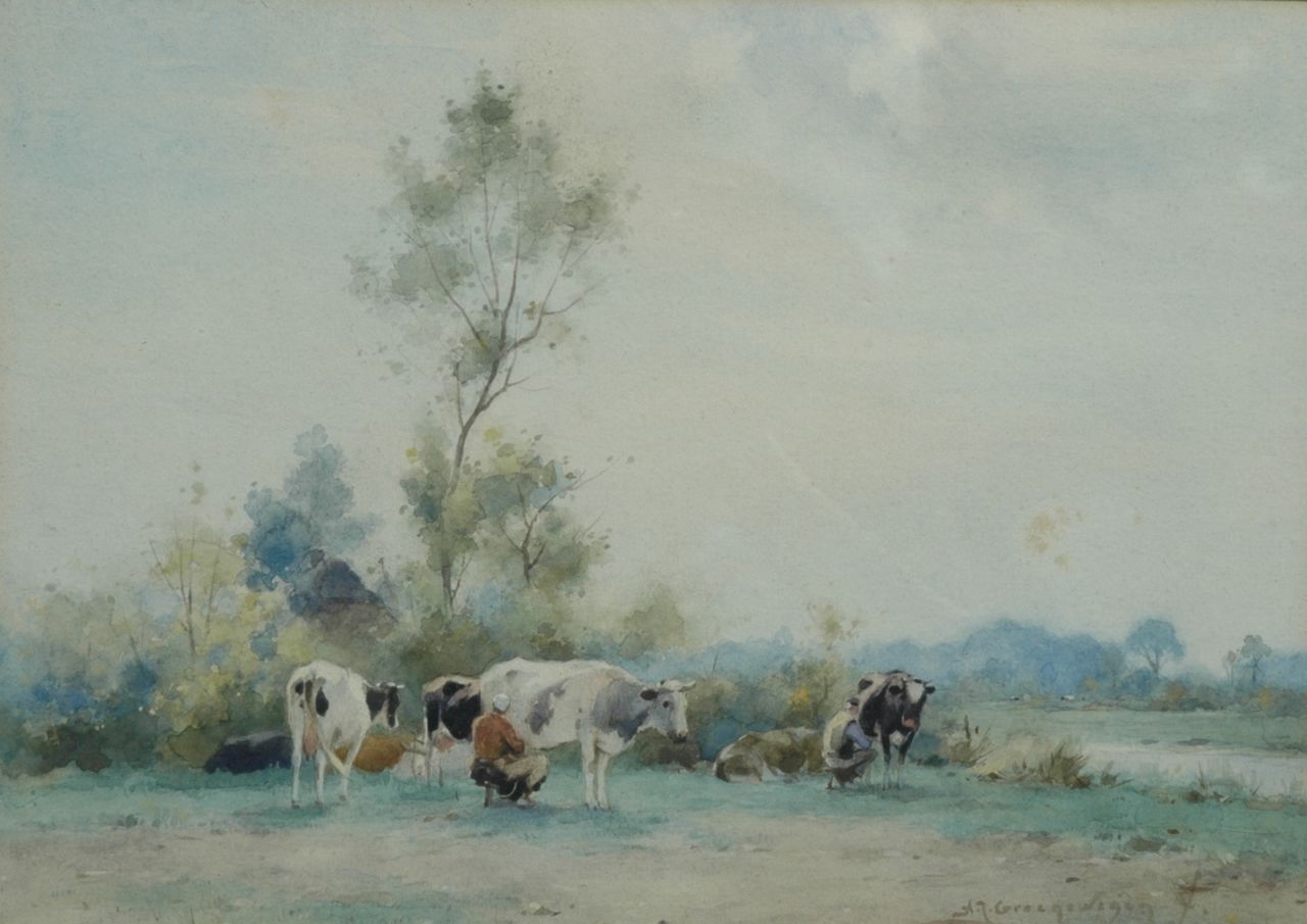 Groenewegen A.J.  | Adrianus Johannes Groenewegen, Melktijd, aquarel op papier 30,5 x 22,0 cm, gesigneerd rechtsonder