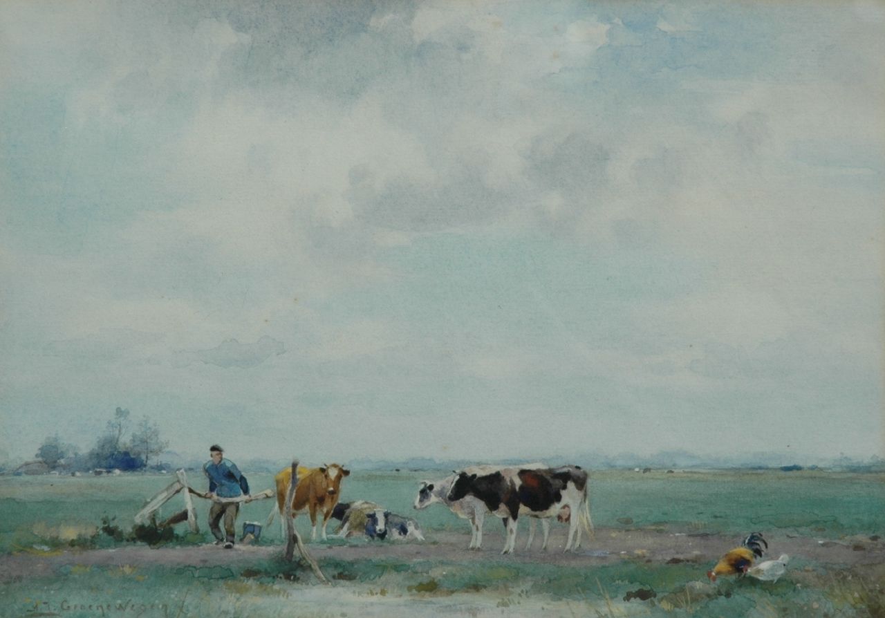 Adriaan Groenewegen wordt wel beschouwd als een van de laatste vertegenwoordigers van de Haagse School. In 1898, 24 jaar oud, trok hij vanuit zijn geboortestad Rotterdam naar Den Haag. Daar ontwikkelde hij al snel een smaak voor het schilderen van groene Hollandse weiden met vee onder ruime luchten; atmosferische impressies, waarin kleuren en vormen versmolten met het typisch Hollandse licht. Met name zijn aquarellen waren zeer geliefd bij Engelse, Canadese en Amerikaanse verzamelaars.