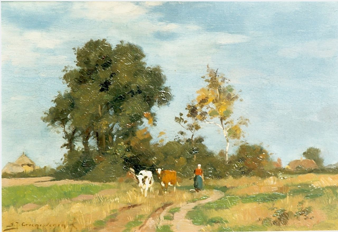 Adriaan Groenewegen kunstwerk • schilderij • voorheen te koop Koeienhoedster in boerenlandschap
