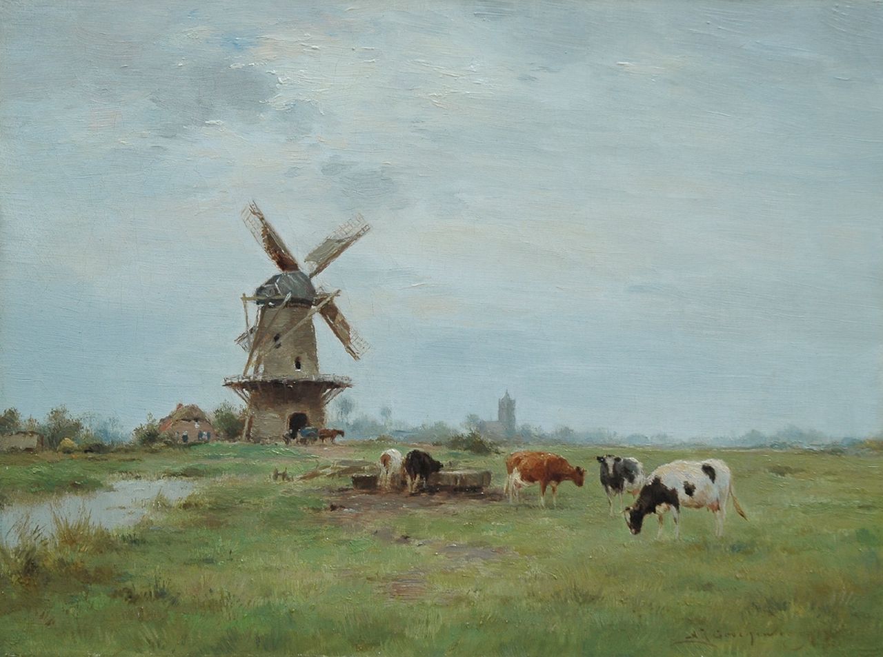 Adriaan Groenewegen kunstwerk • schilderij • voorheen te koop Polderlandschap met molen en vee