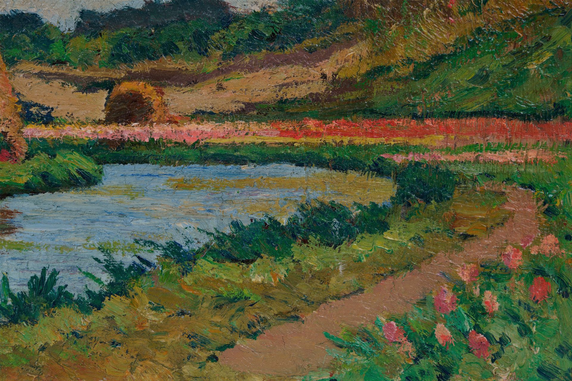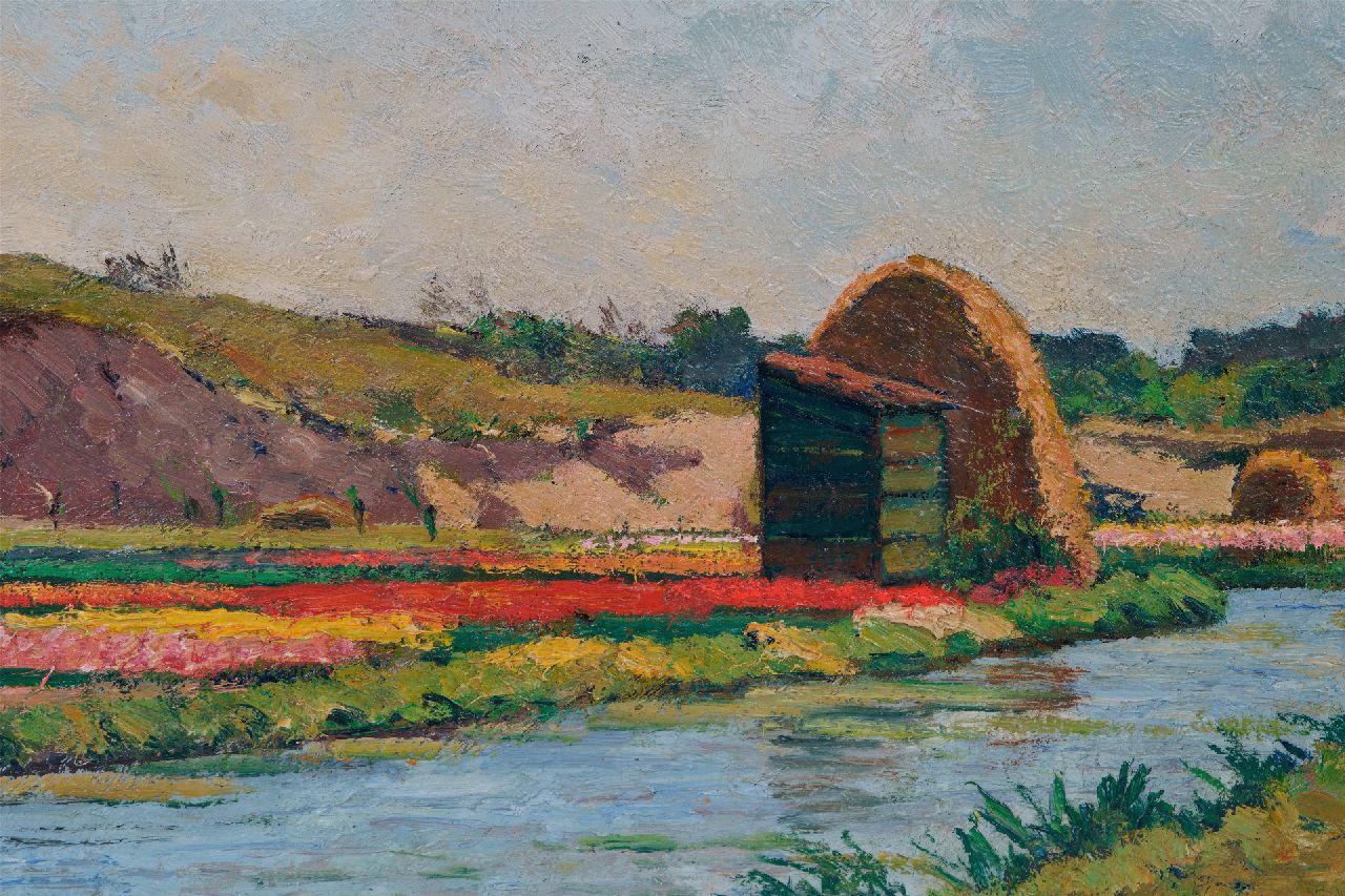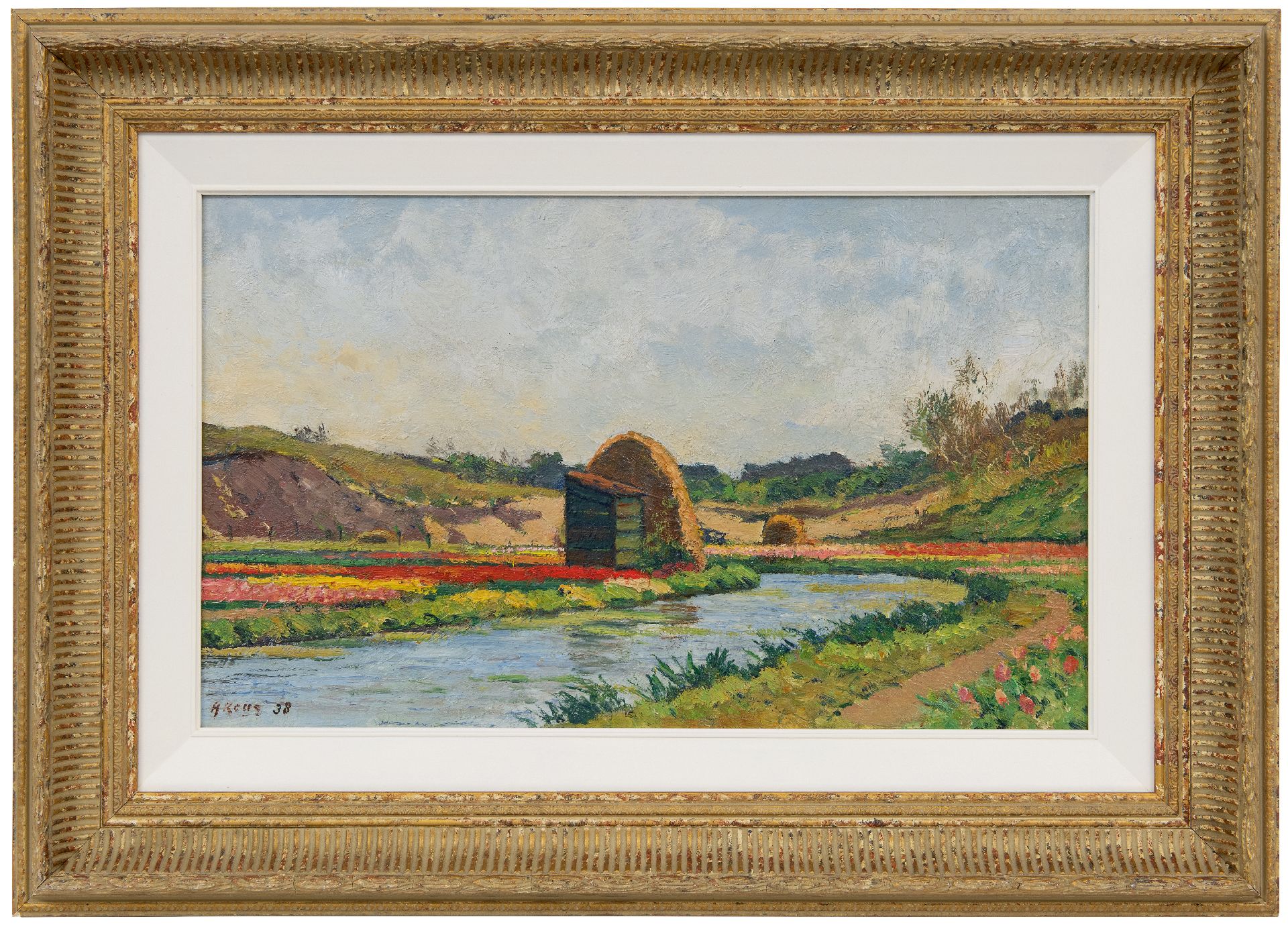 Adriaan Keus kunstwerk • schilderij • te koop Bollenveld met rietschelf achter de duinen bij Overveen