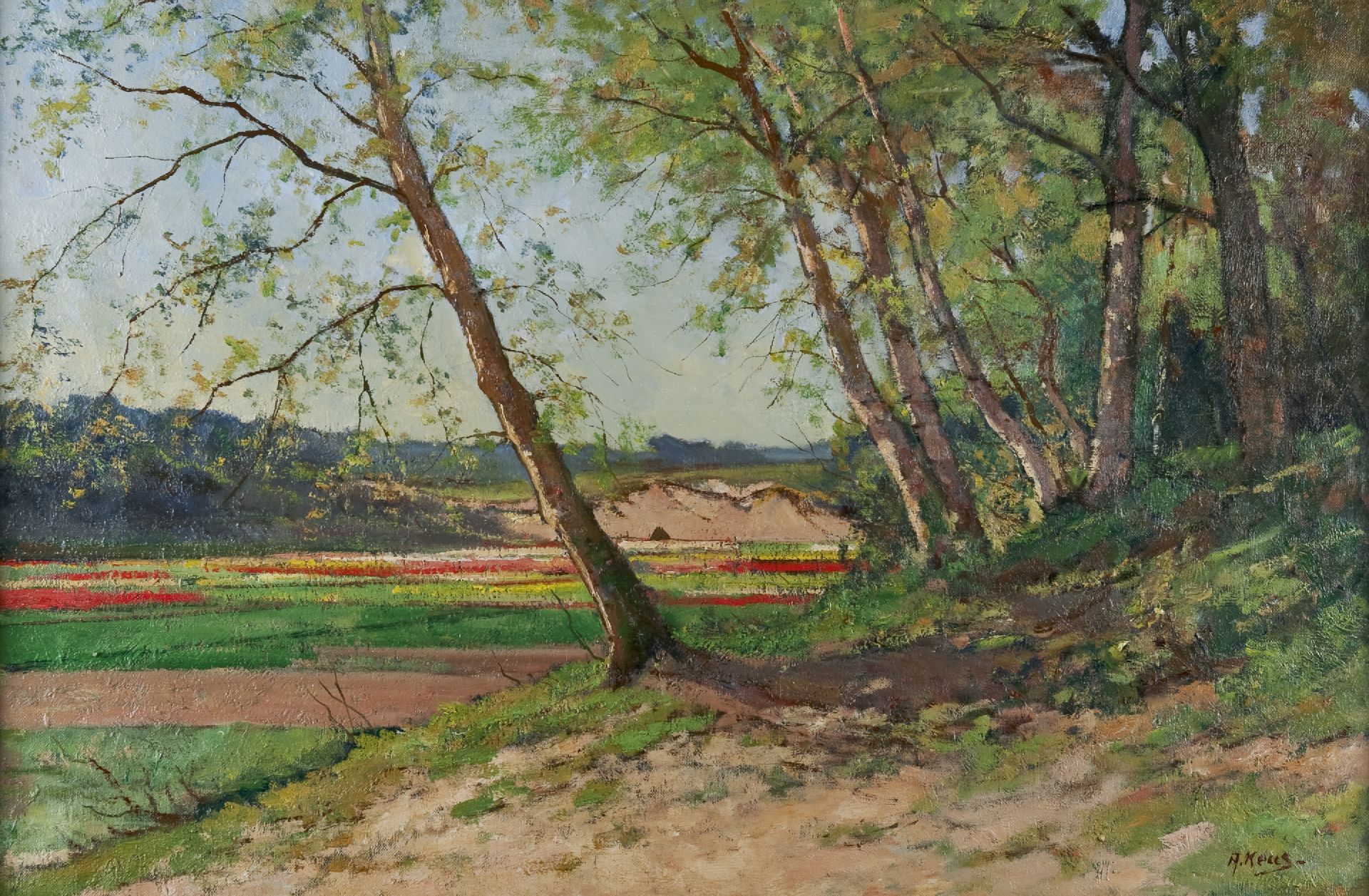 Adriaan Keus kunstwerk • schilderij • voorheen te koop Bosrand met uitzicht op bollenvelden