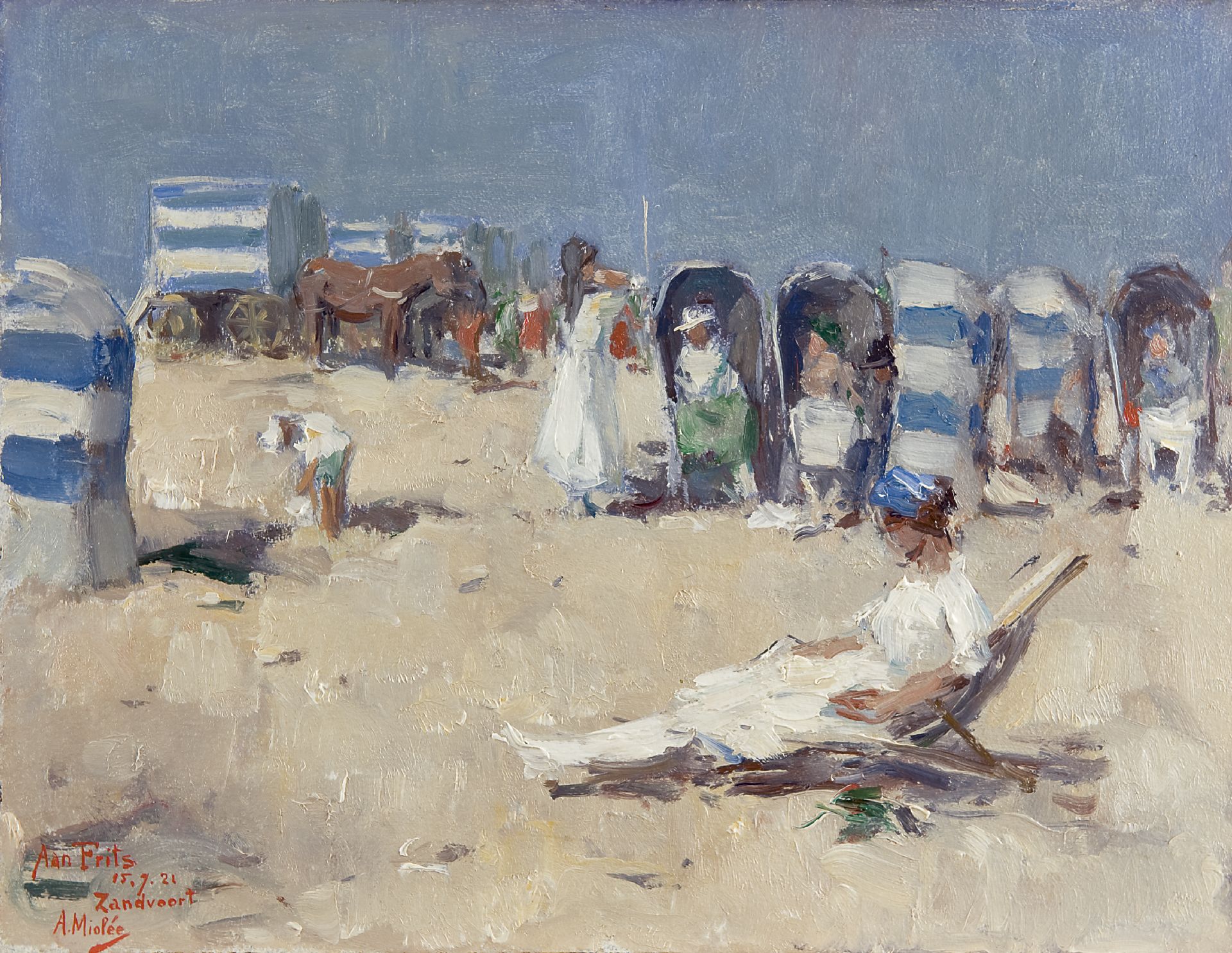 Adriaan Miolée kunstwerk • schilderij • voorheen te koop Een dagje aan het strand, Zandvoort