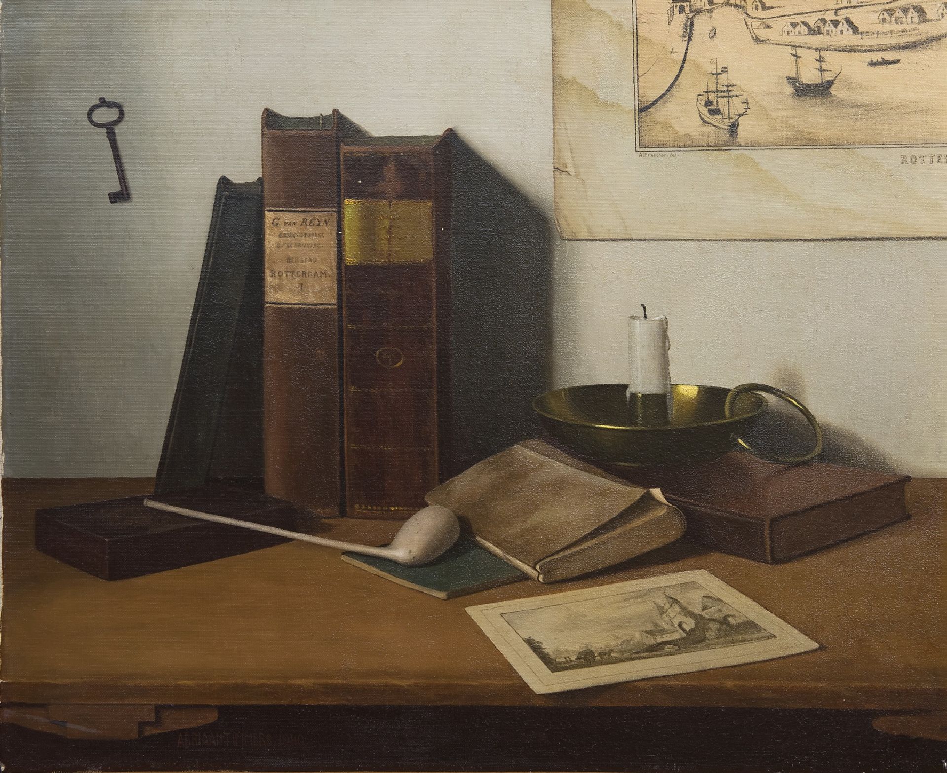 Adriaan Timmers kunstwerk • schilderij • te koop Stilleven met boeken en een prent van Rotterdam