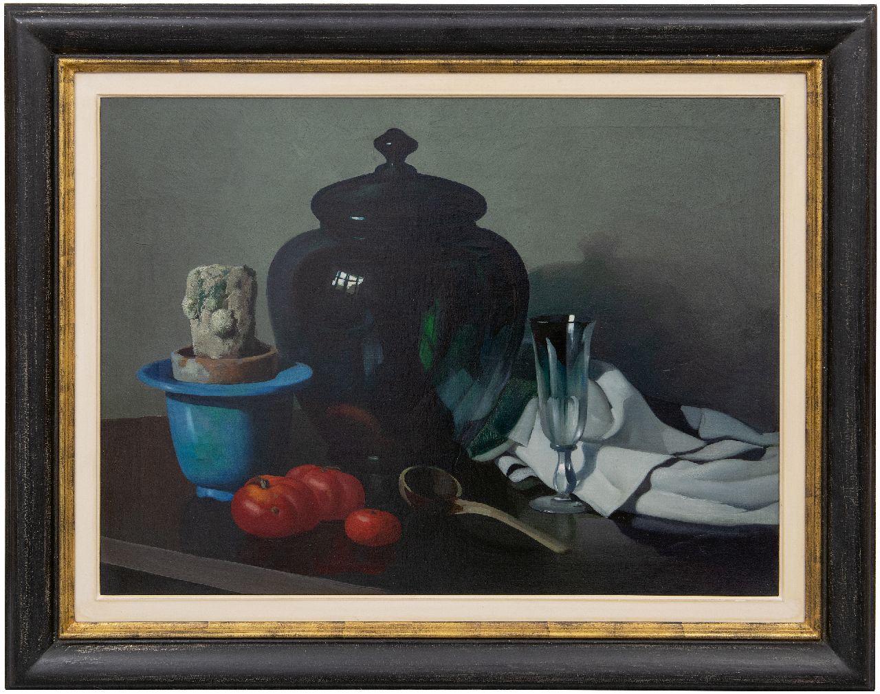 Adriaan van 't Hoff kunstwerk • schilderij • te koop Stilleven met cactus in een pot, glazen bowl en tomaten