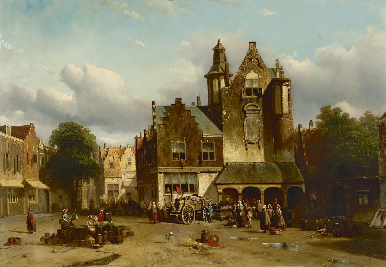 Adriaan Vrolijk kunstwerk • schilderij • voorheen te koop Marktgezicht met visbank en gebouw geïnspireerd op het Haagse Binnenhof
