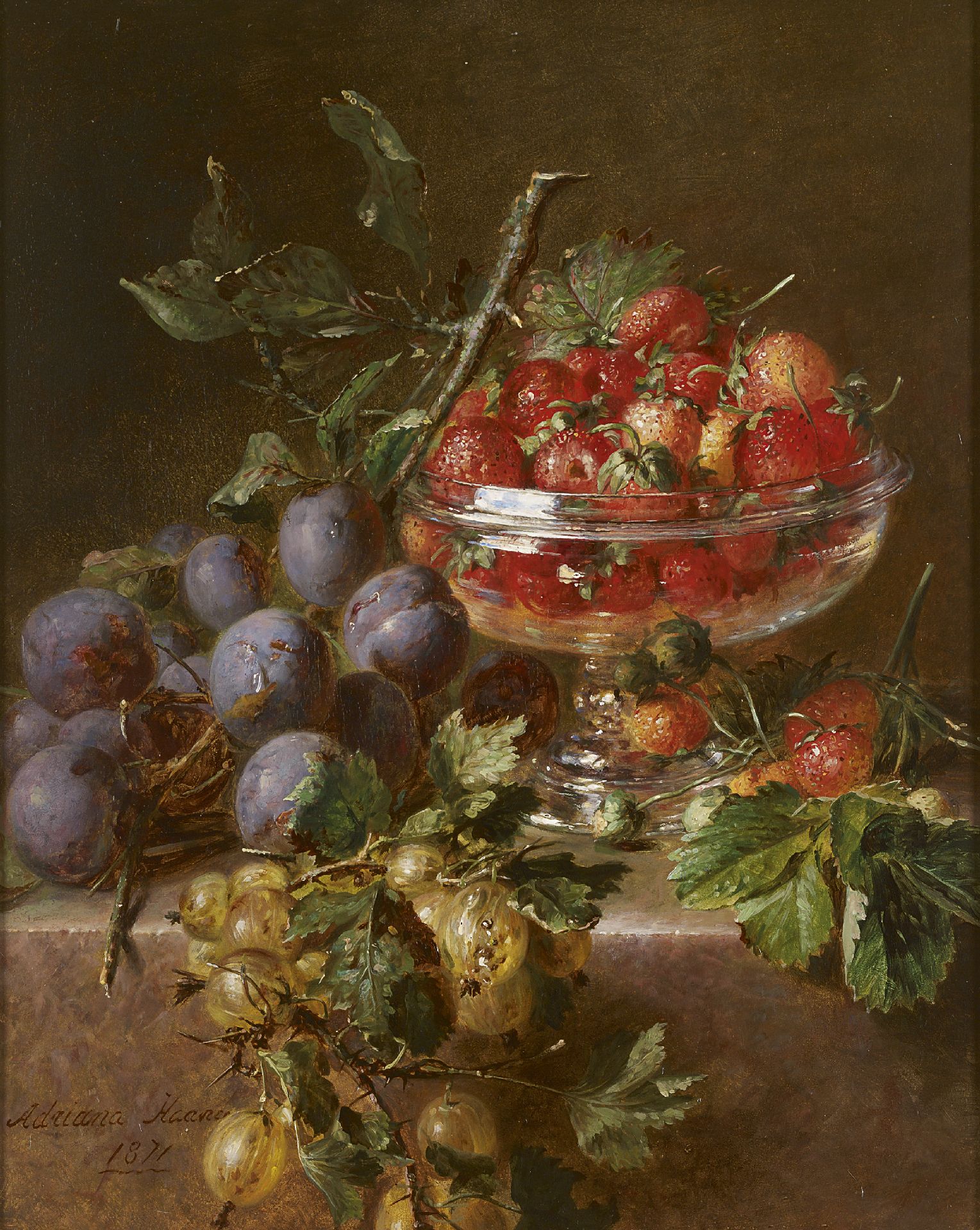 Adriana Haanen kunstwerk • schilderij • voorheen te koop Fruitstilleven met pruimen, kruisbessen en aardbeien in glazen schaal