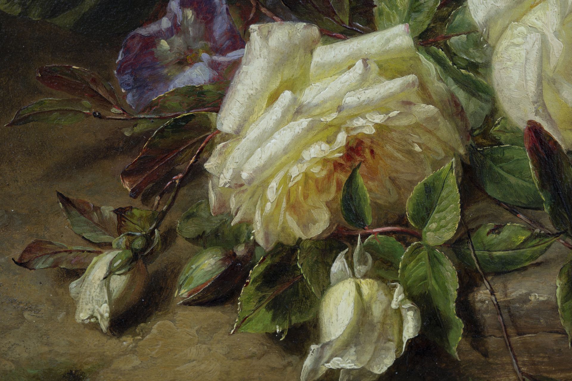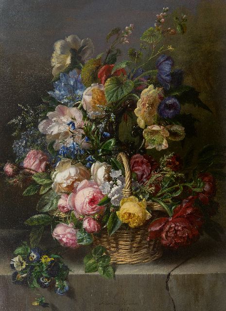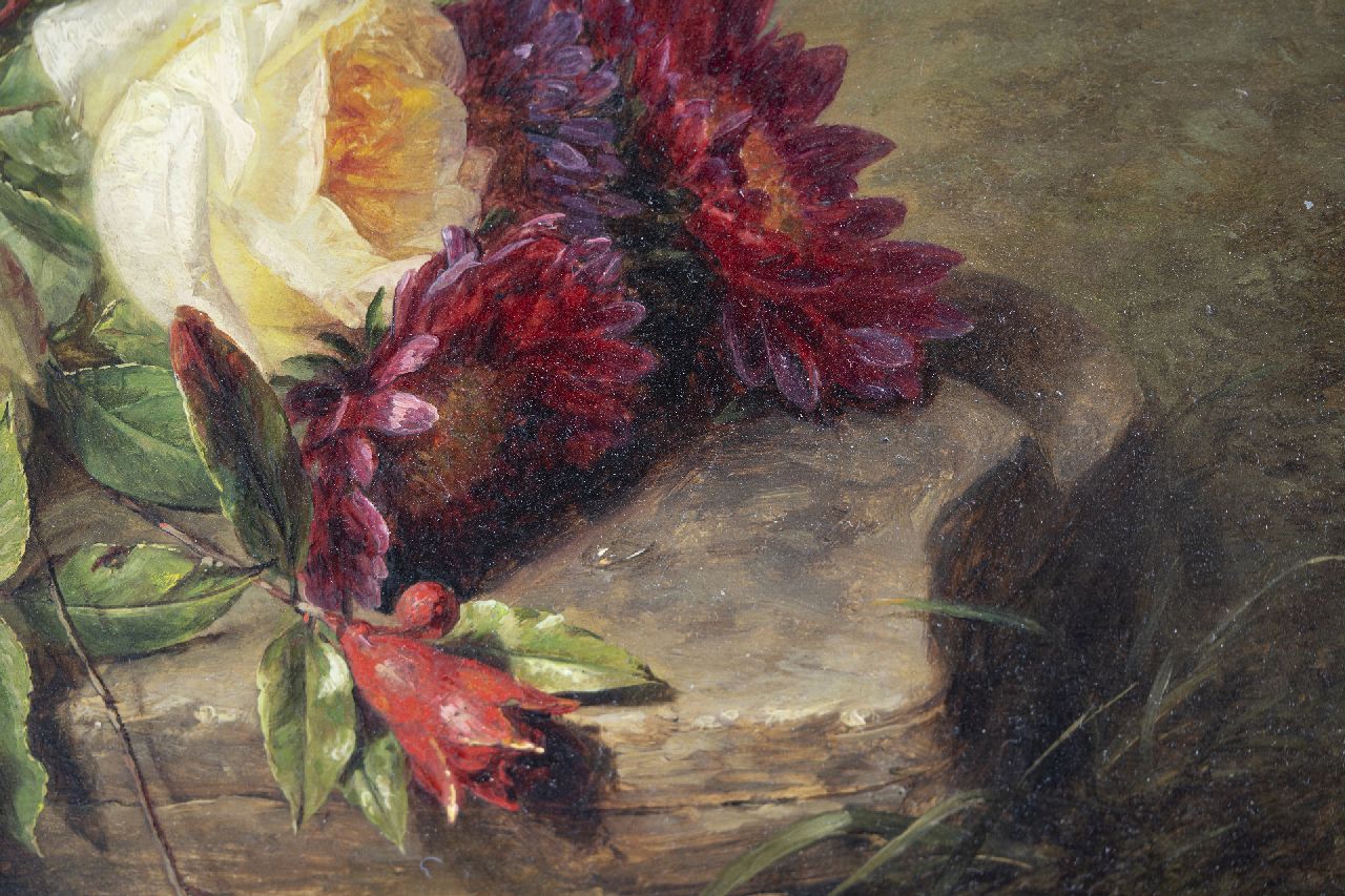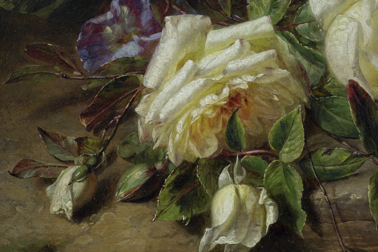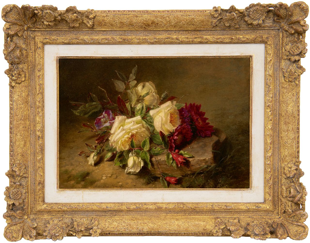 Adriana Haanen kunstwerk • schilderij • te koop Rozen en chrysanten op de bosgrond