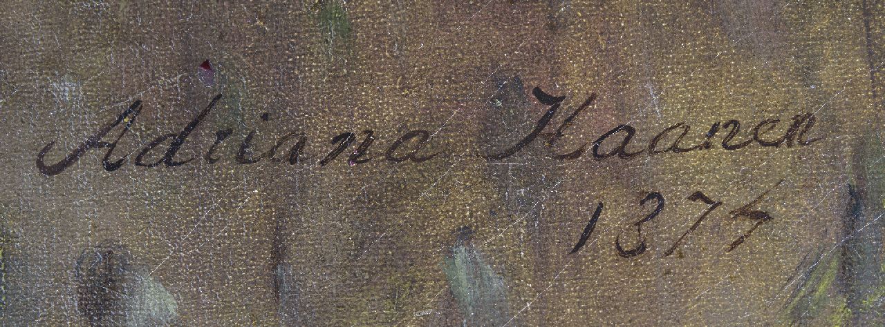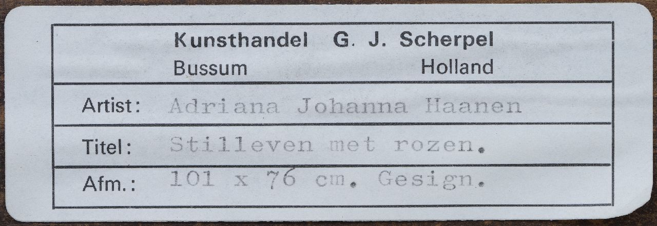 Adriana Haanen was gespecialiseerd in het schilderen van stillevens met bloemen en vruchten, soms met dood wild. In haar werk is de verandering te zien van het tradionele, stijf gearrangeerde bloemstilleven van de 17e en 18e eeuw naar de 'natuurlijke' boeketten en stillevens van de 19e eeuw. Evenals de jongere Margaretha Roosenboom en Gerardine van de Sande Bakhuyzen schonk zij aandacht aan het natuurlijk aanzien en het eigen karakter van de bloemen die ze afbeeldde. Adriana Haanen hield van ongedwongen arrangementen, soms in een mand, in een krachtig koloriet.