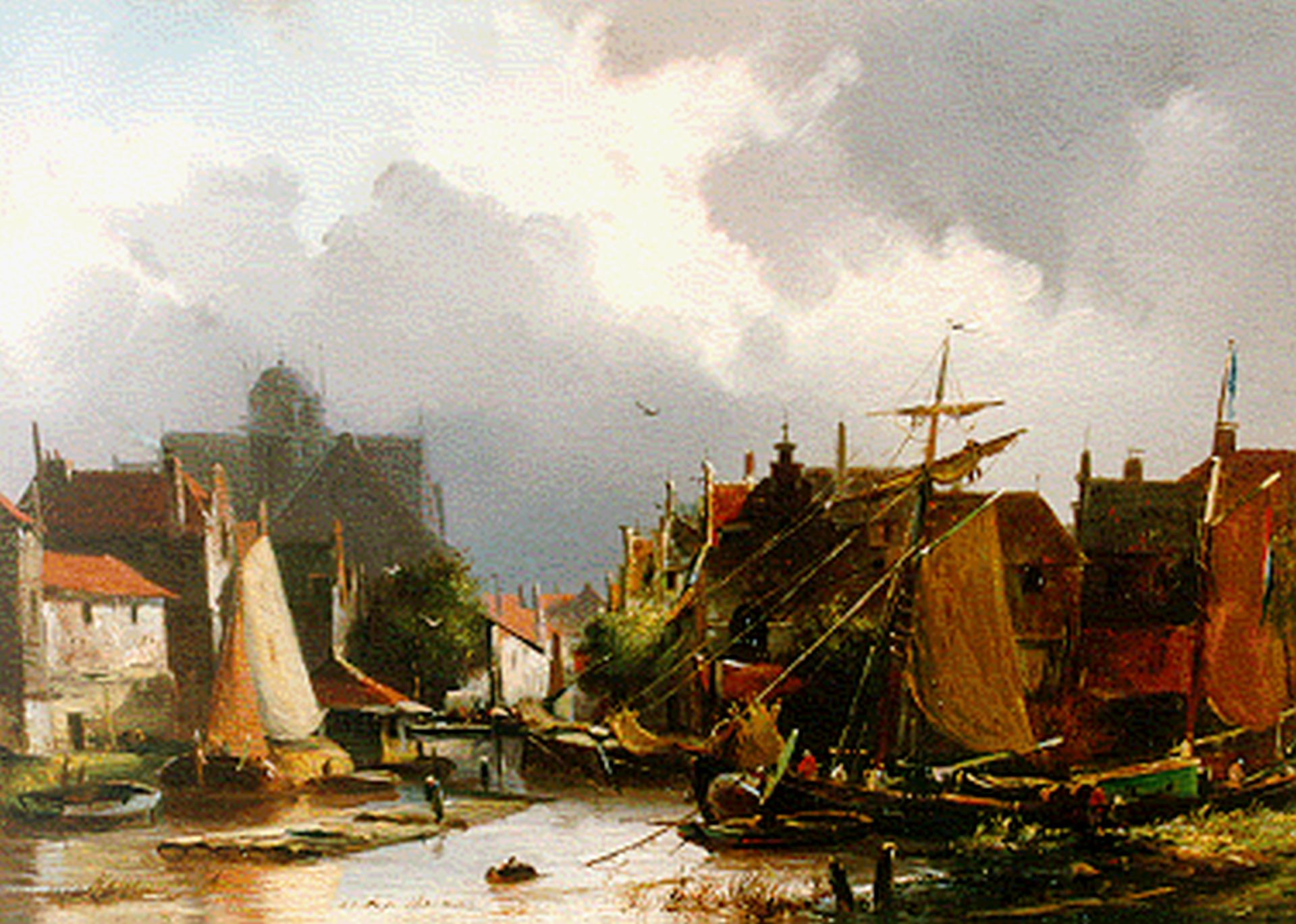 Adrianus David Hilleveld kunstwerk • schilderij • voorheen te koop Gezicht op stadshaventje