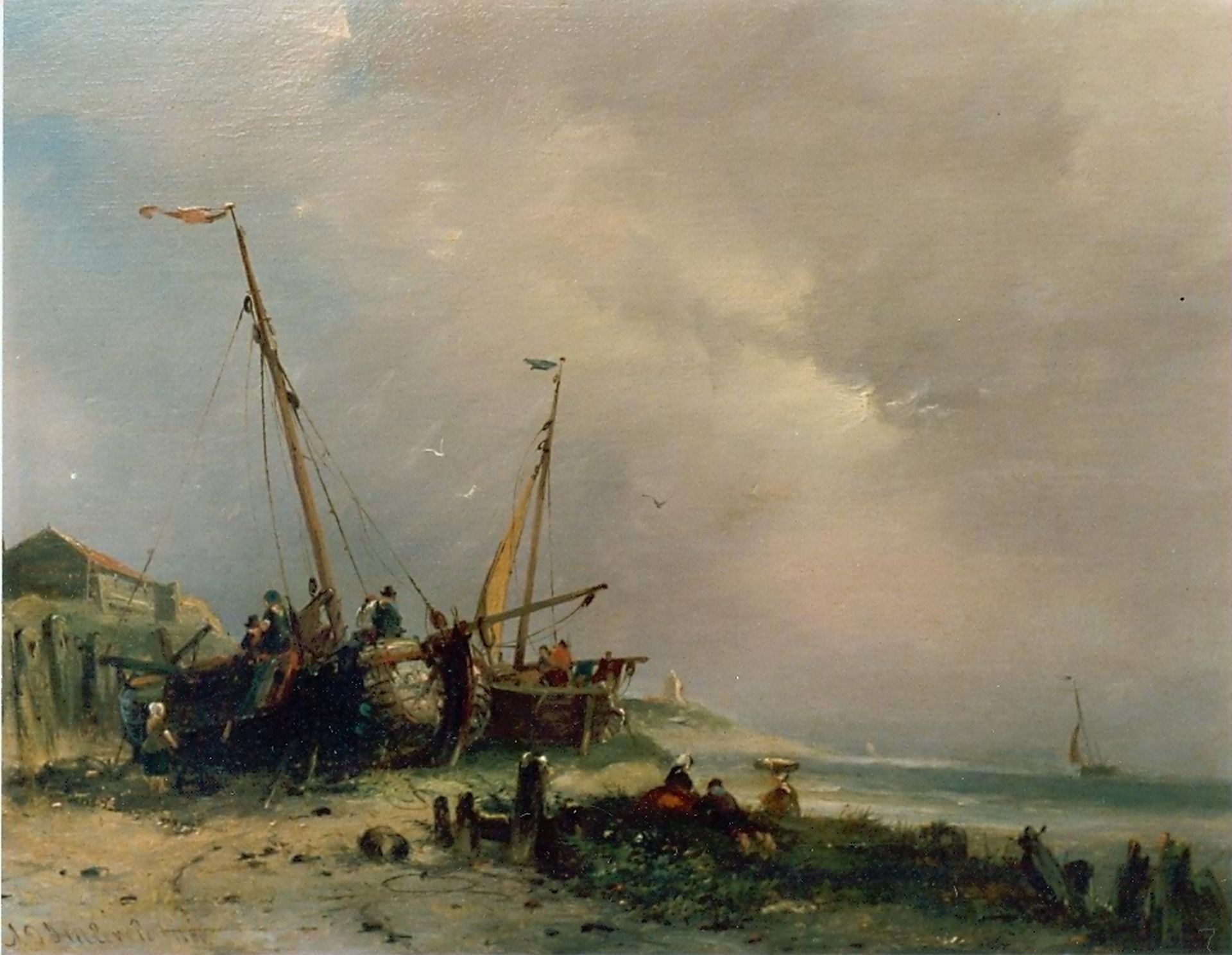 Adrianus David Hilleveld kunstwerk • schilderij • voorheen te koop Vissers en bommen op het strand
