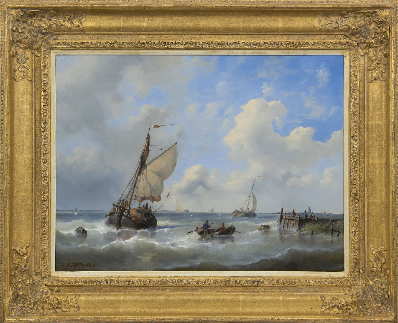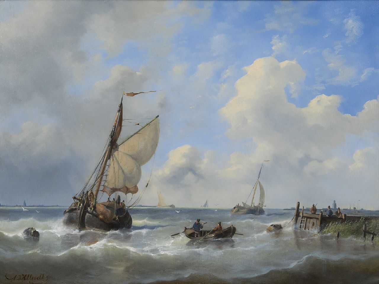 Adrianus David Hilleveld kunstwerk • schilderij • te koop Zeilschepen bij een havenhoofd
