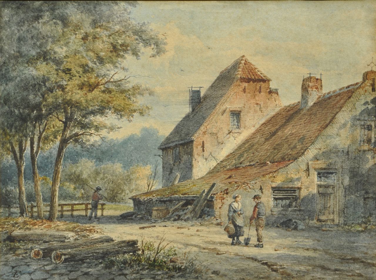 Adrianus Eversen kunstwerk • aquarel • tekening • voorheen te koop Landvolk bij een boerderij
