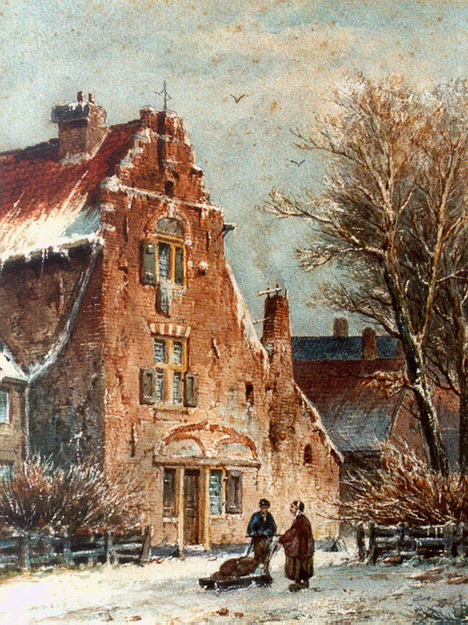 Adrianus Eversen kunstwerk • aquarel • tekening • voorheen te koop Stadsgezicht met twee figuren bij een slee