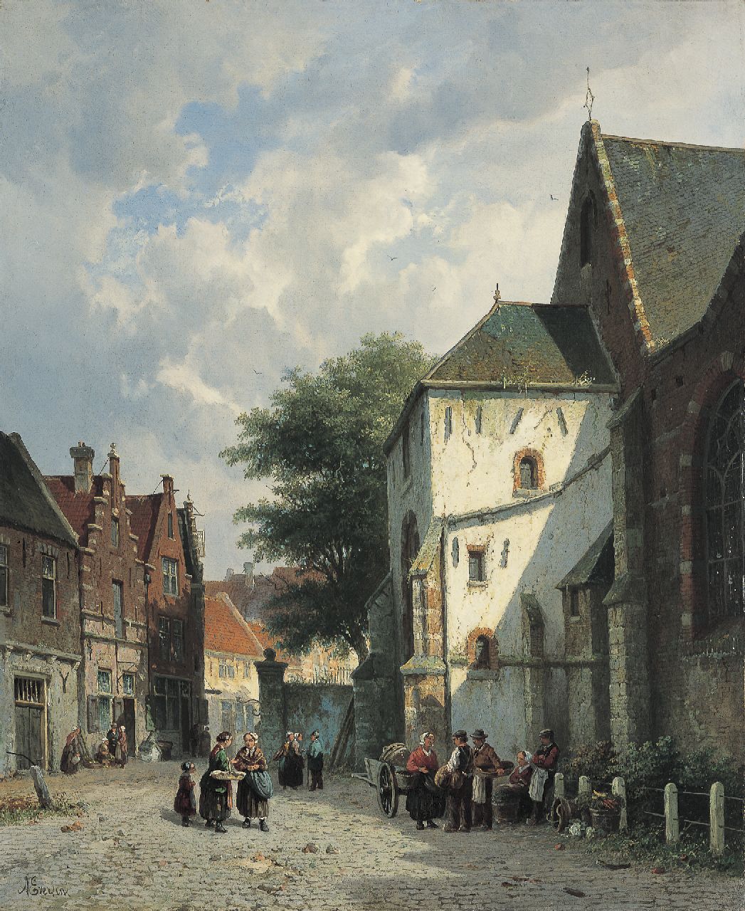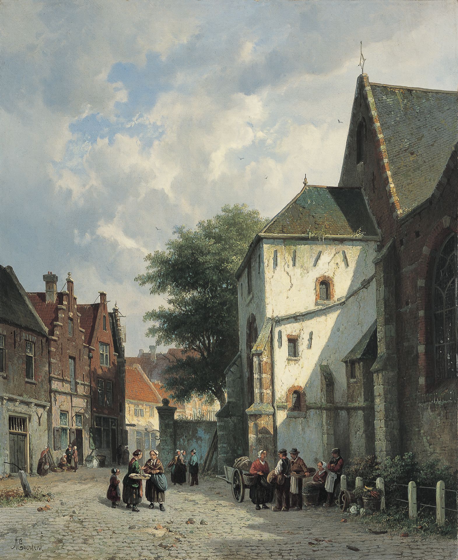 Adrianus Eversen kunstwerk • schilderij • voorheen te koop Bedrijvigheid bij een kerk