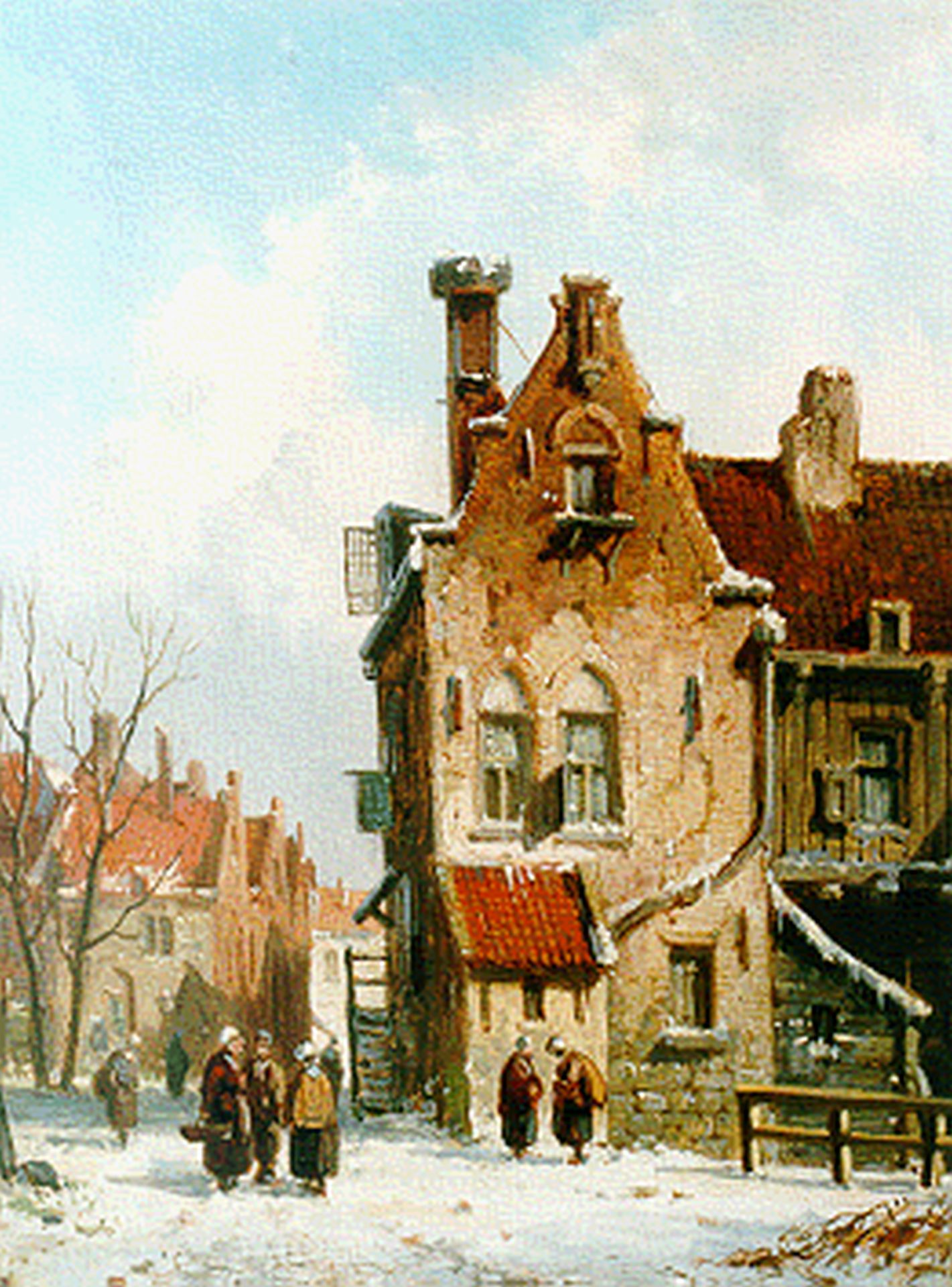 Adrianus Eversen kunstwerk • schilderij • voorheen te koop Drukbevolkt straatje in de winter