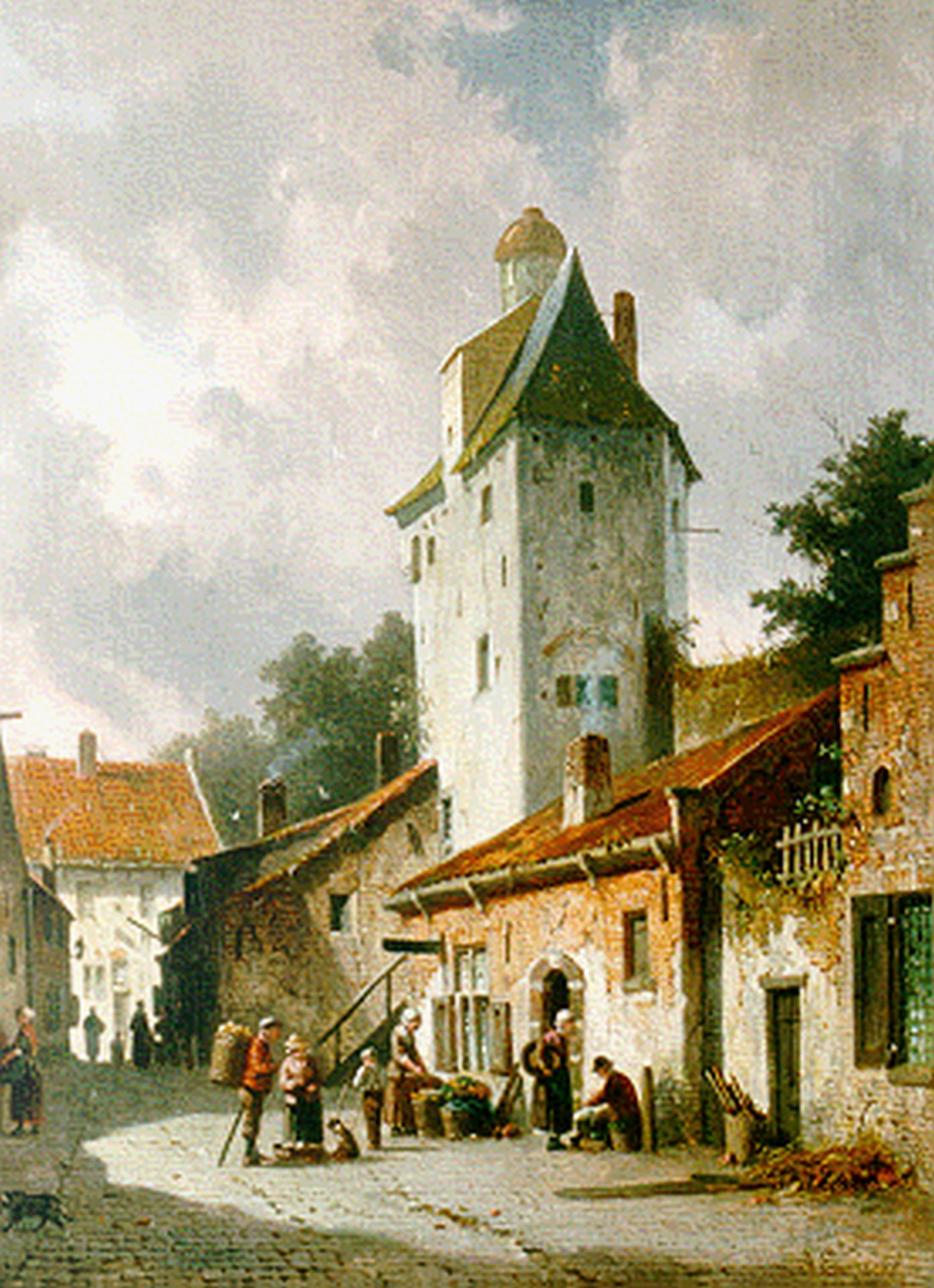 Adrianus Eversen kunstwerk • schilderij • voorheen te koop Drukbevolkt zomers straatje
