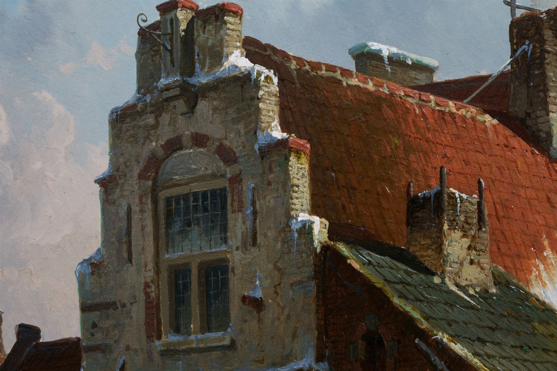 Adrianus Eversen | Besneeuwd gezicht achter de Westerkerk in Enkhuizen  (verkoop alleen samen met zomers pendant, tezamen), olieverf op paneel, 35,7 x 27,6 cm, gesigneerd l.o.