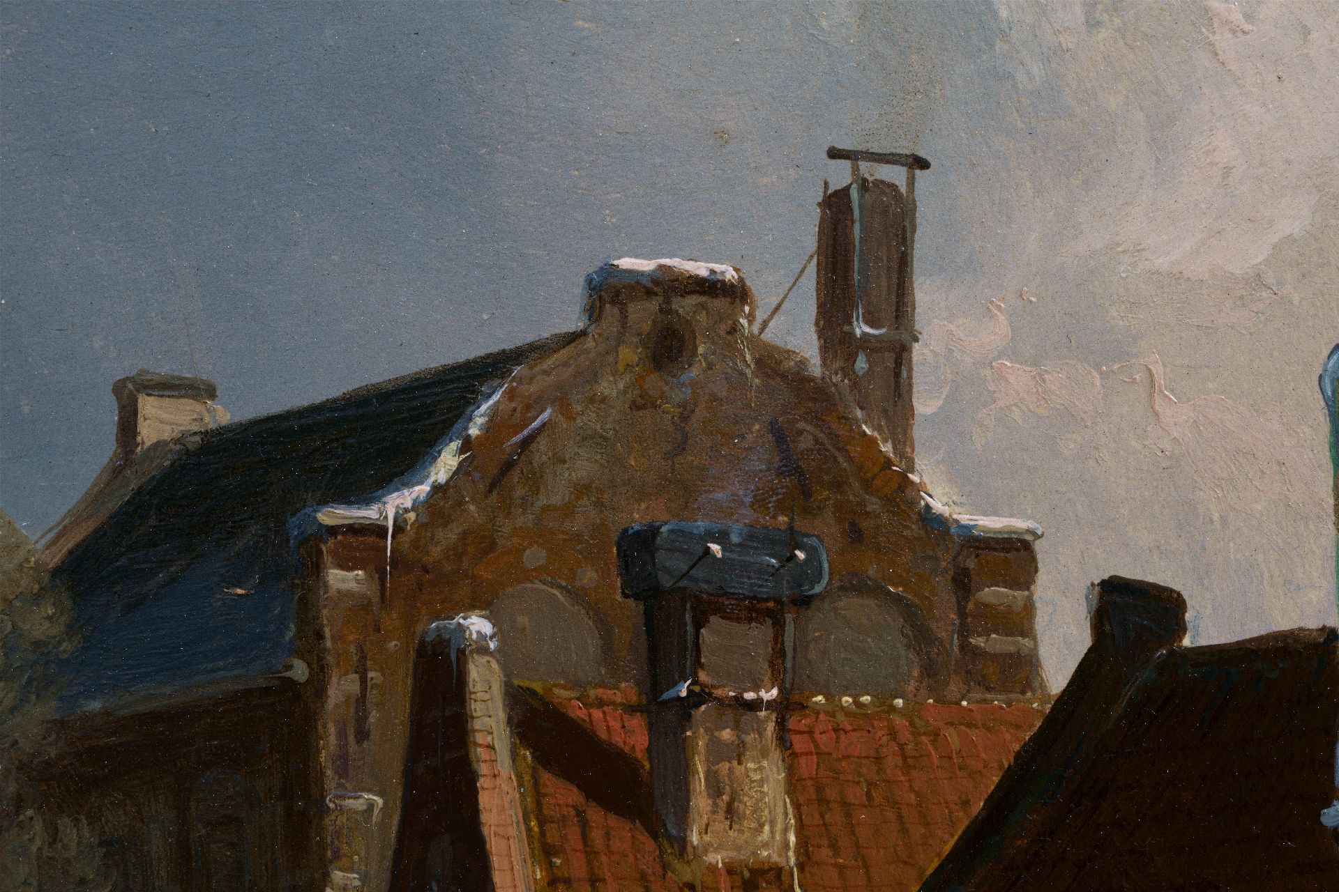 Adrianus Eversen | Hollands stadsgezicht, olieverf op paneel, 19,5 x 15,5 cm, gesigneerd l.o. met monogram en verso op etiket voluit