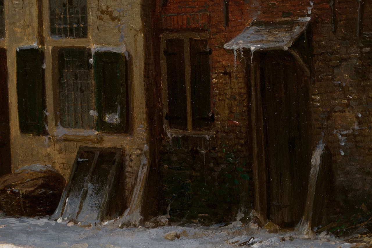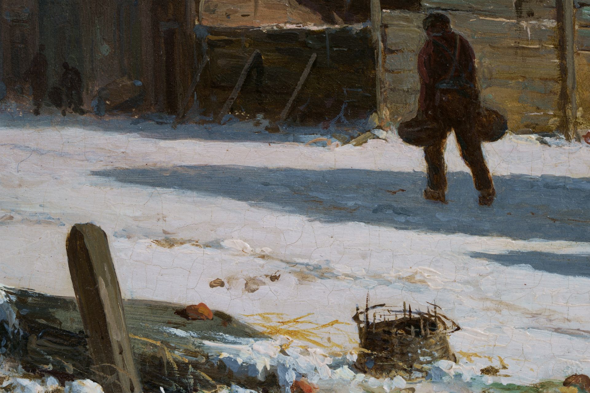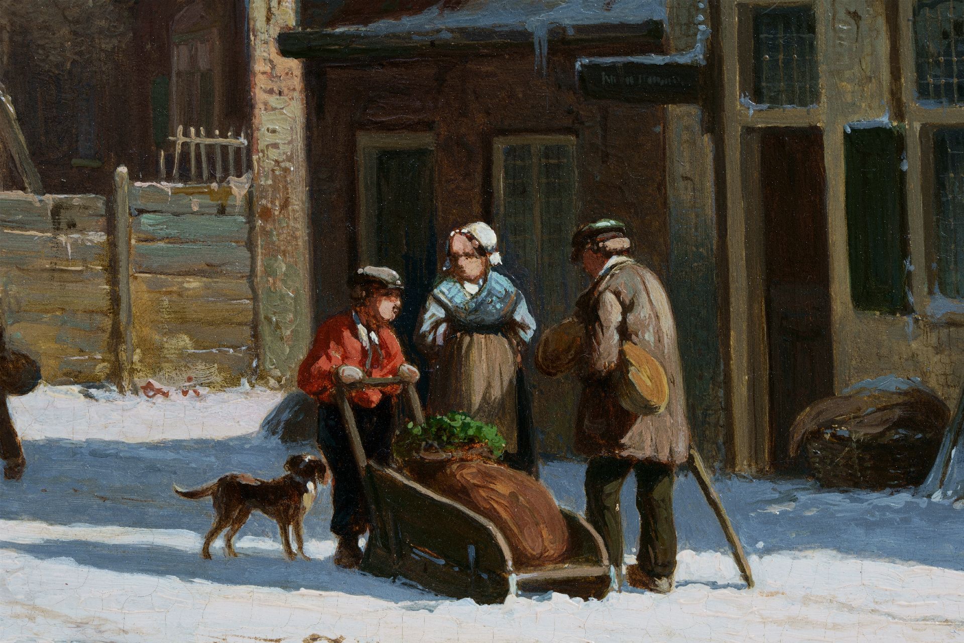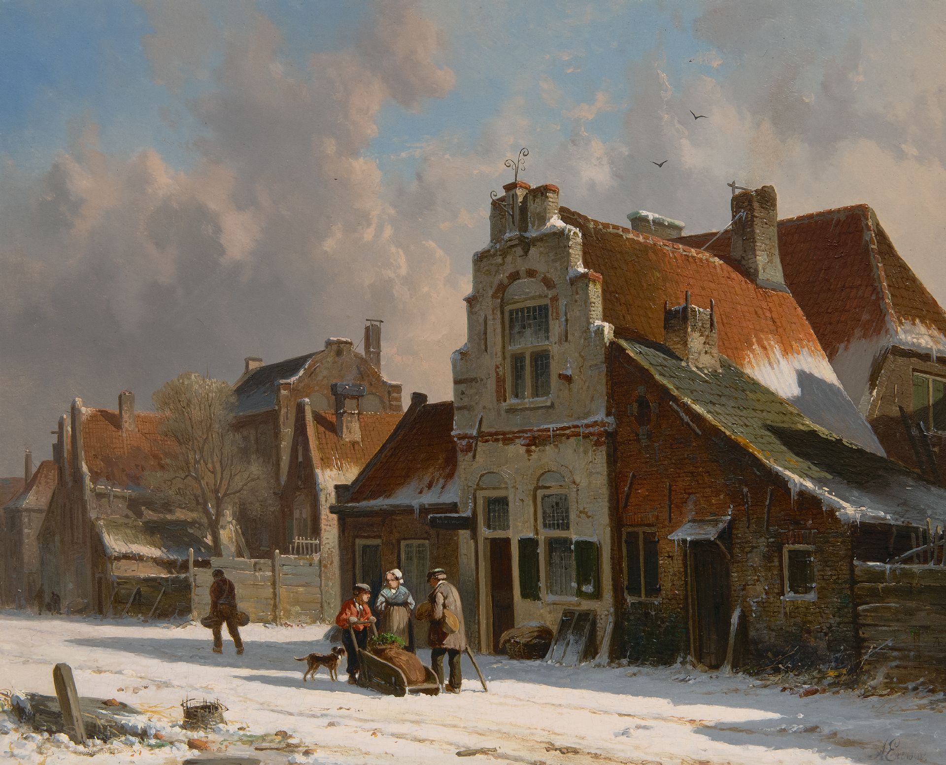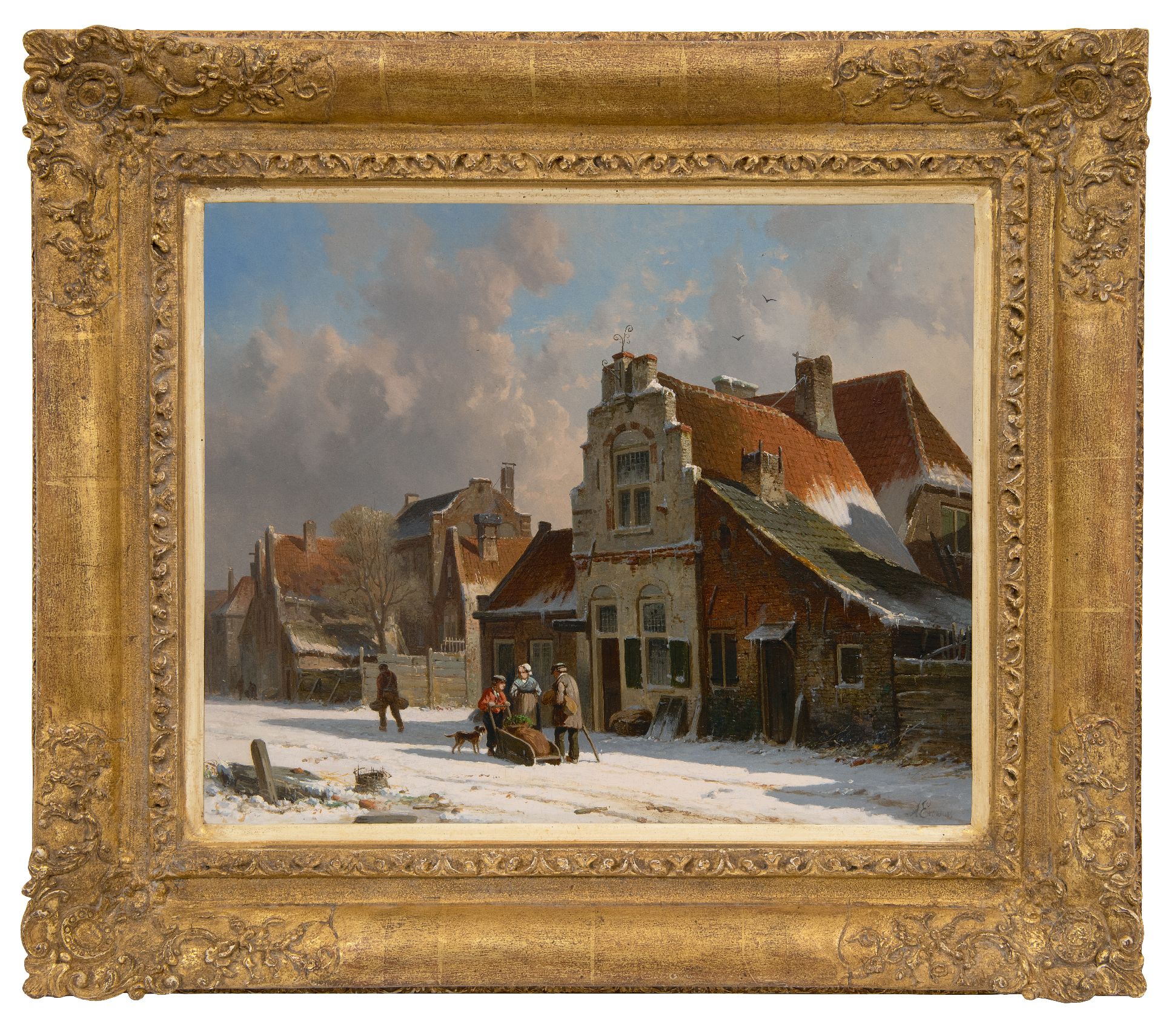 Adrianus Eversen kunstwerk • schilderij • voorheen te koop Figuren bij een slede in besneeuwde straat