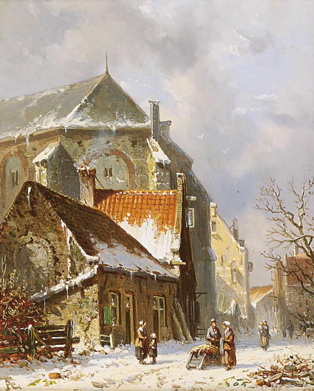 Adrianus Eversen kunstwerk • schilderij • voorheen te koop Figuren in een met sneeuw bedekt straatje