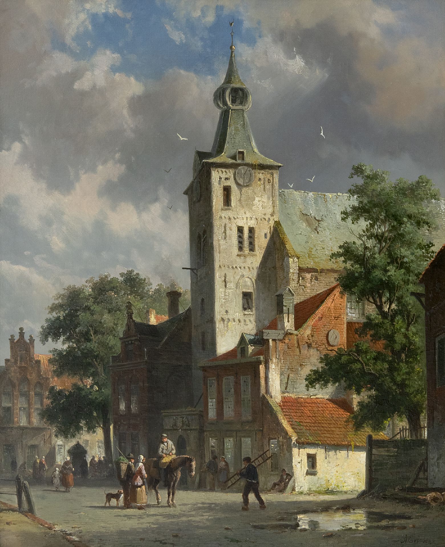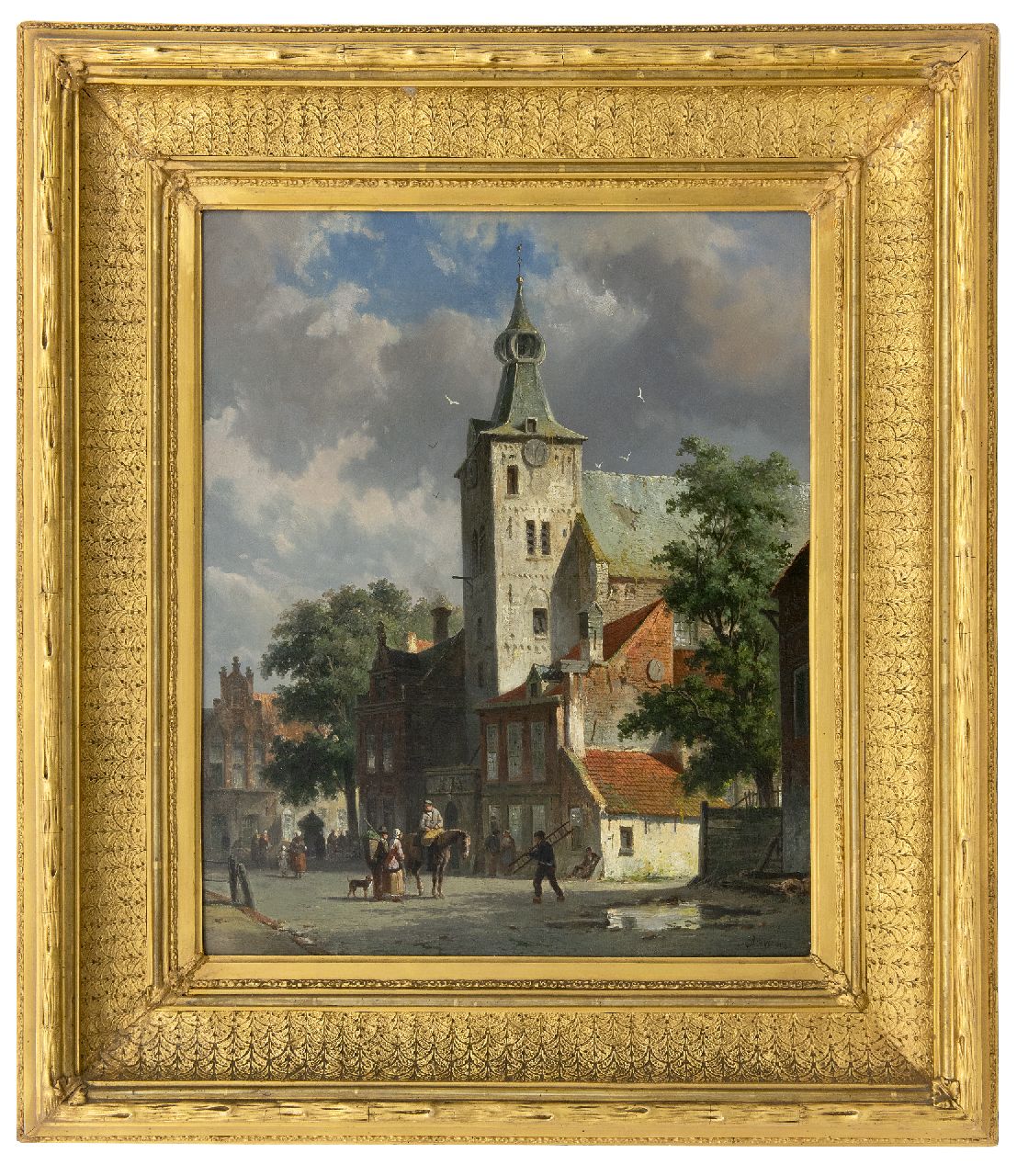 Adrianus Eversen | Zonnig stadsgezicht (mogelijk Harderwijk), olieverf op paneel, 19,2 x 15,2 cm, gesigneerd r.o. met monogram