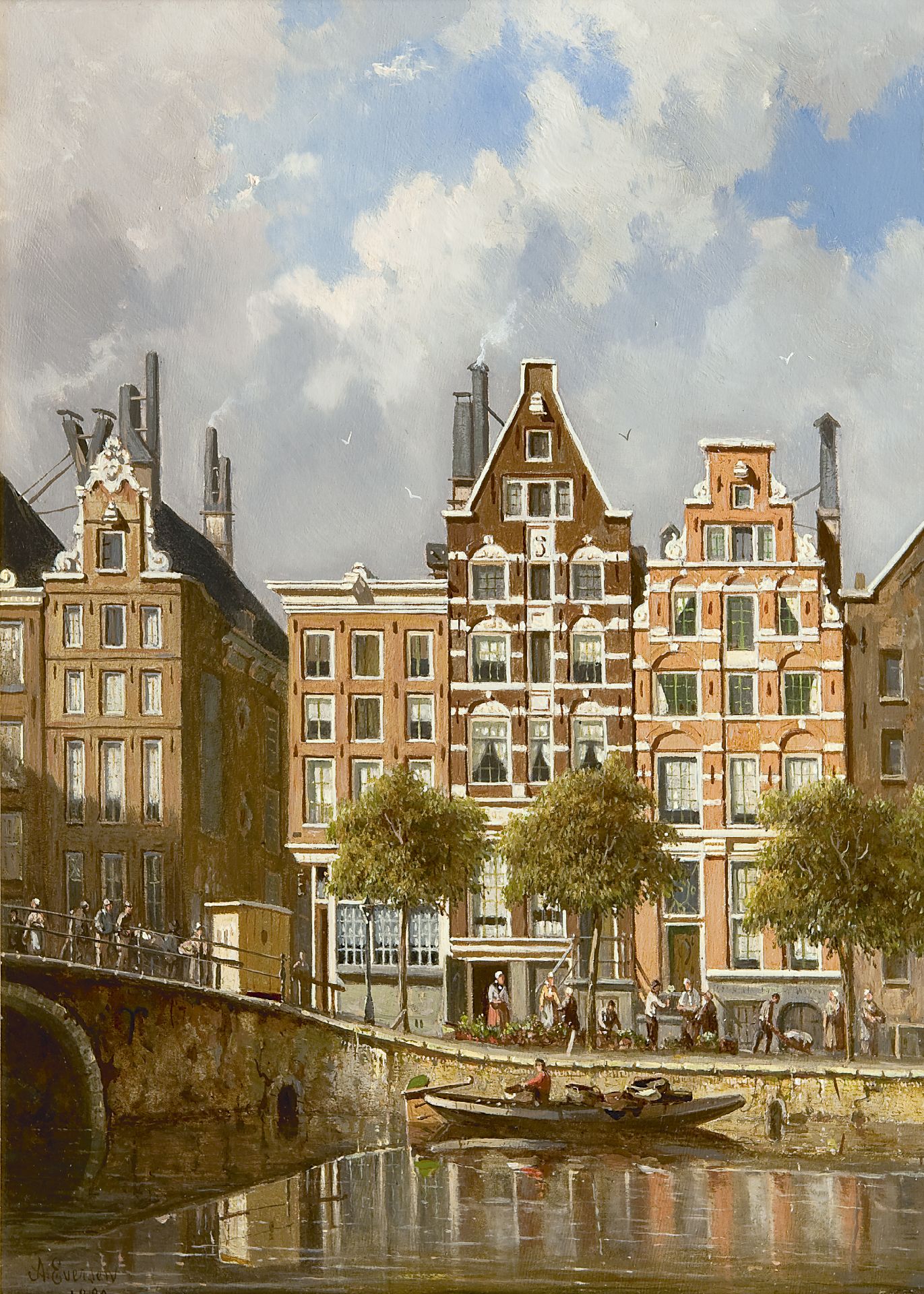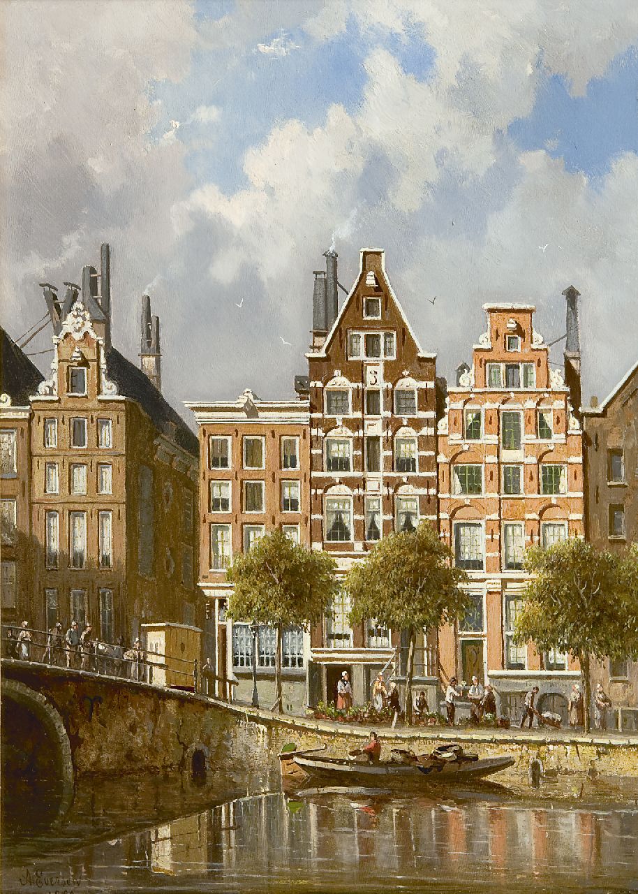 Adrianus Eversen kunstwerk • schilderij • voorheen te koop Gezicht op de Nieuwezijds Voorburgwal, Amsterdam