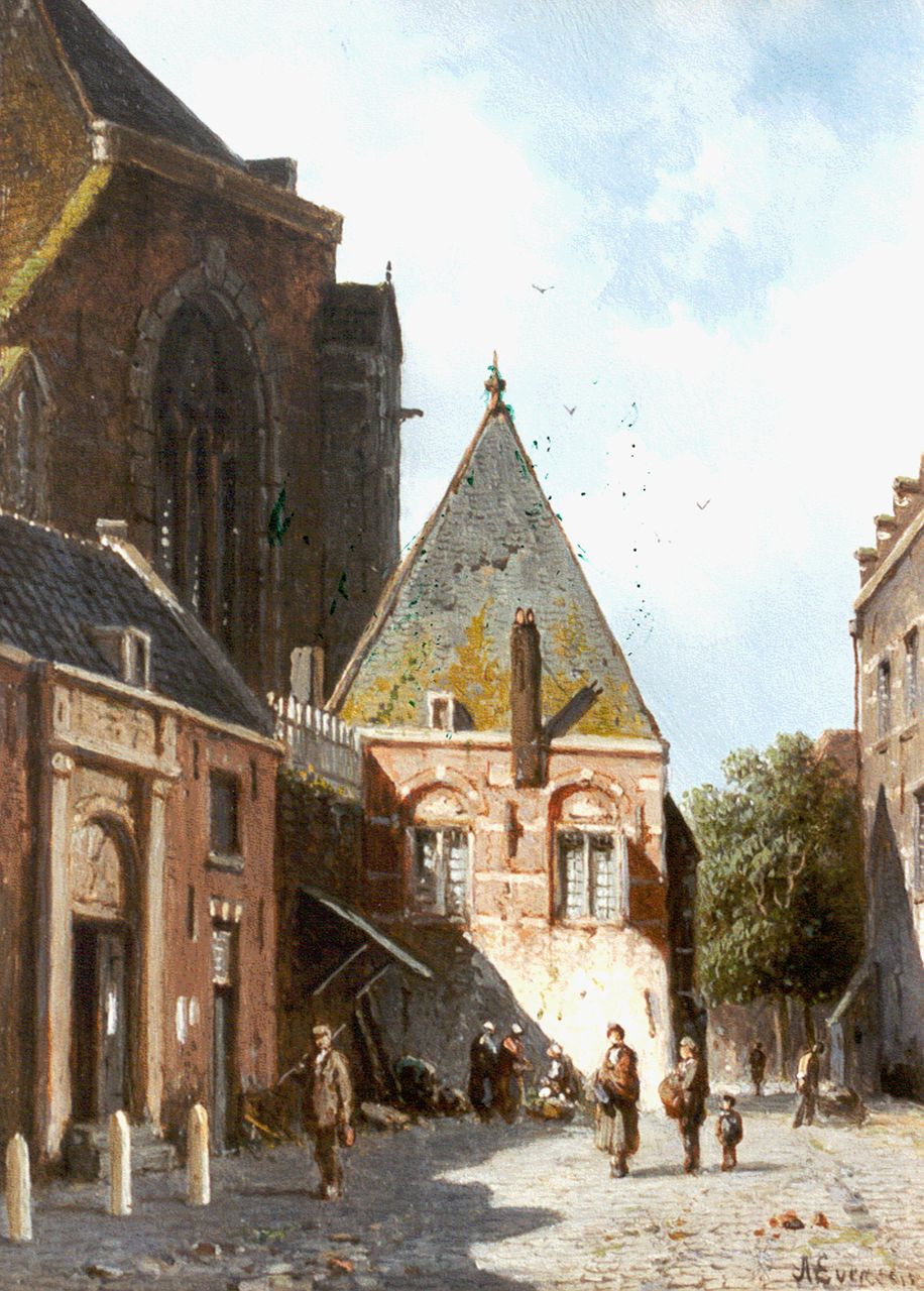 Adrianus Eversen kunstwerk • schilderij • voorheen te koop Gezicht op een zonnig kerkplein