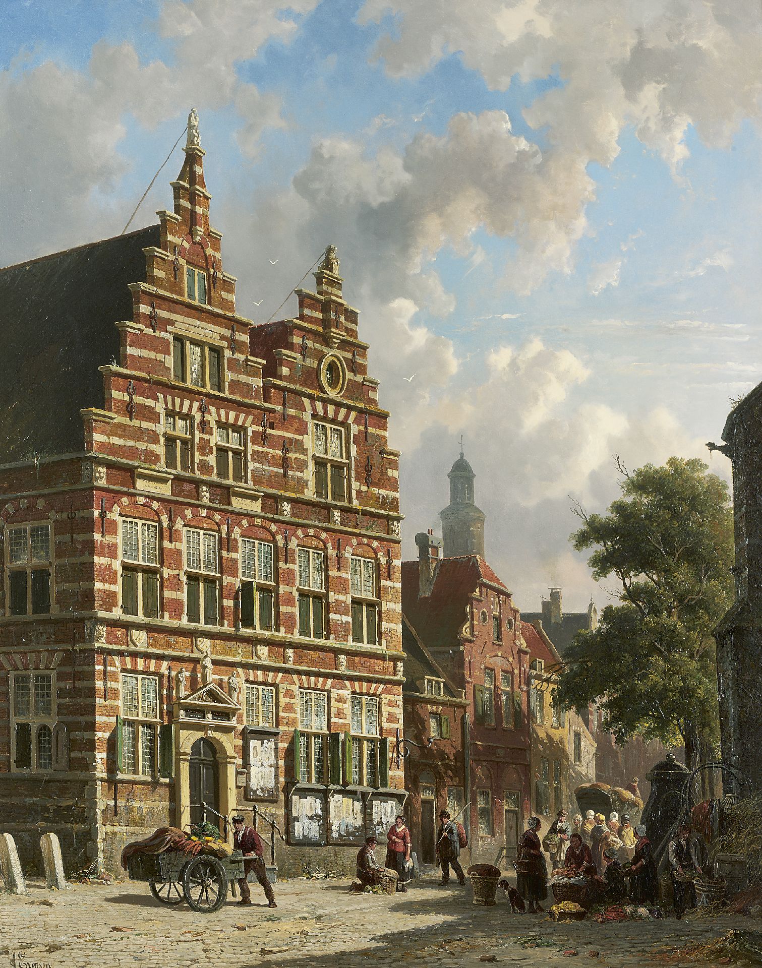 Adrianus Eversen kunstwerk • schilderij • voorheen te koop Groentehandel voor het Oude Gemeentehuis Naarden Vesting